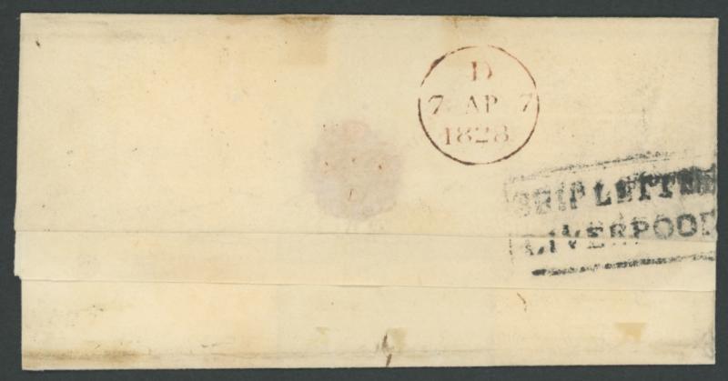 Primitive (ii); rated RRR), boxed 'SHIP LETTER/LIVERPOOL' transit and London '7 AP 7/1828' in red arrival backstamps, rated "1/7"[d] for 8d inwards ship letter plus 1/1d inland carriage, some minor aging marks. Ex John Barwis: sold at our auction of