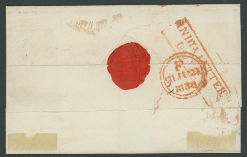 datestamp (Hardinge Primitive (iii); rated RR), the reverse with boxed 'INDIA LETTER/DOVER' and London arrival backstamp of '21JU21/1838', rated "1/4"[d] for 8d inwards ship letter plus 8d inland carriage, light horizontal filing fold clear of the