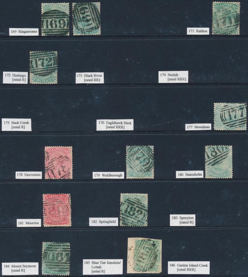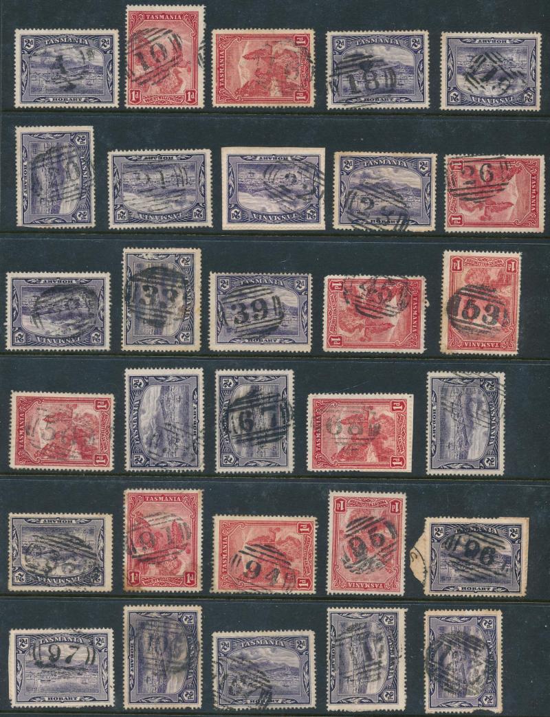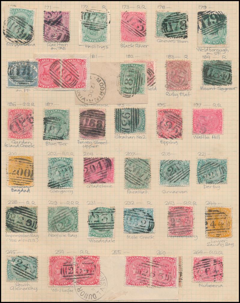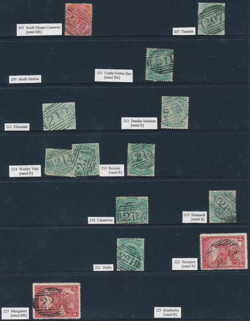 '120' of Northdown, '211' of Castle Forbes Bay, '223' of Mangalore on 1d Pictorial, '228' of Premaydena, '229' of Taranna, '240' of Berriedale, '252' of Pyengana, '254' of Whitefoord Hills, '256' of Kindred, '283' of Andover, '302' of Snake Plains,