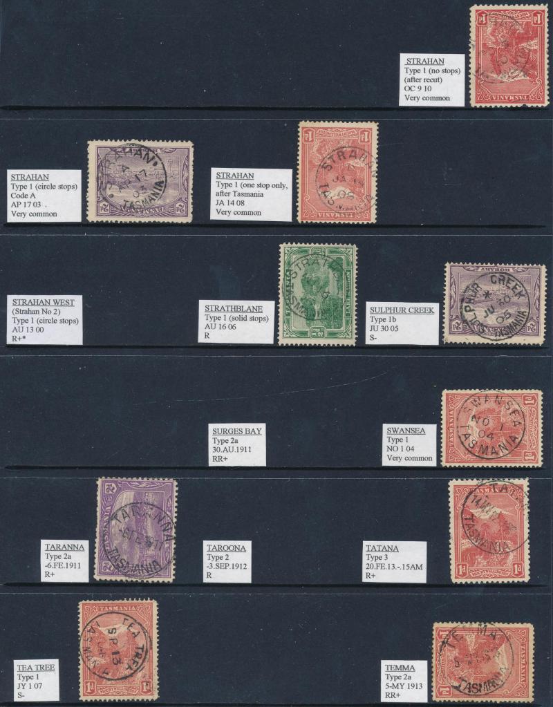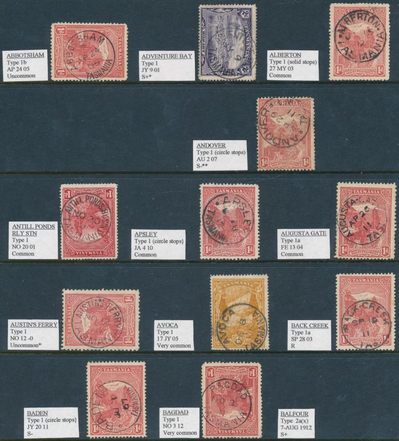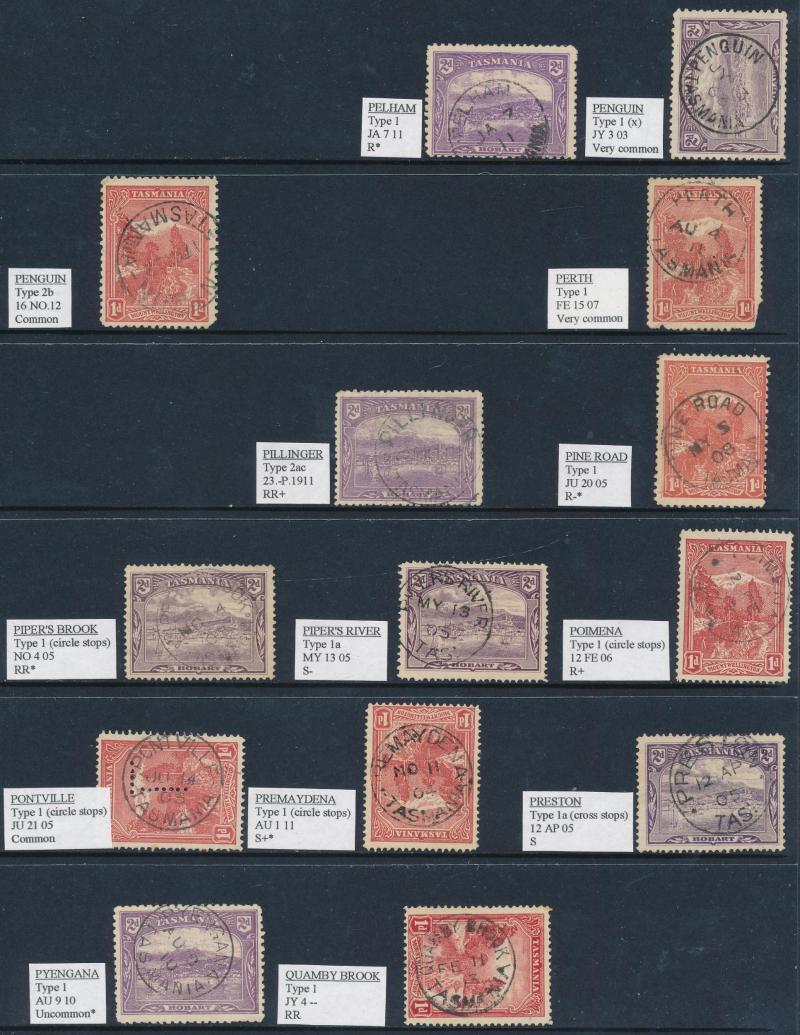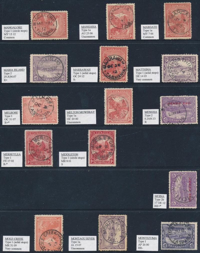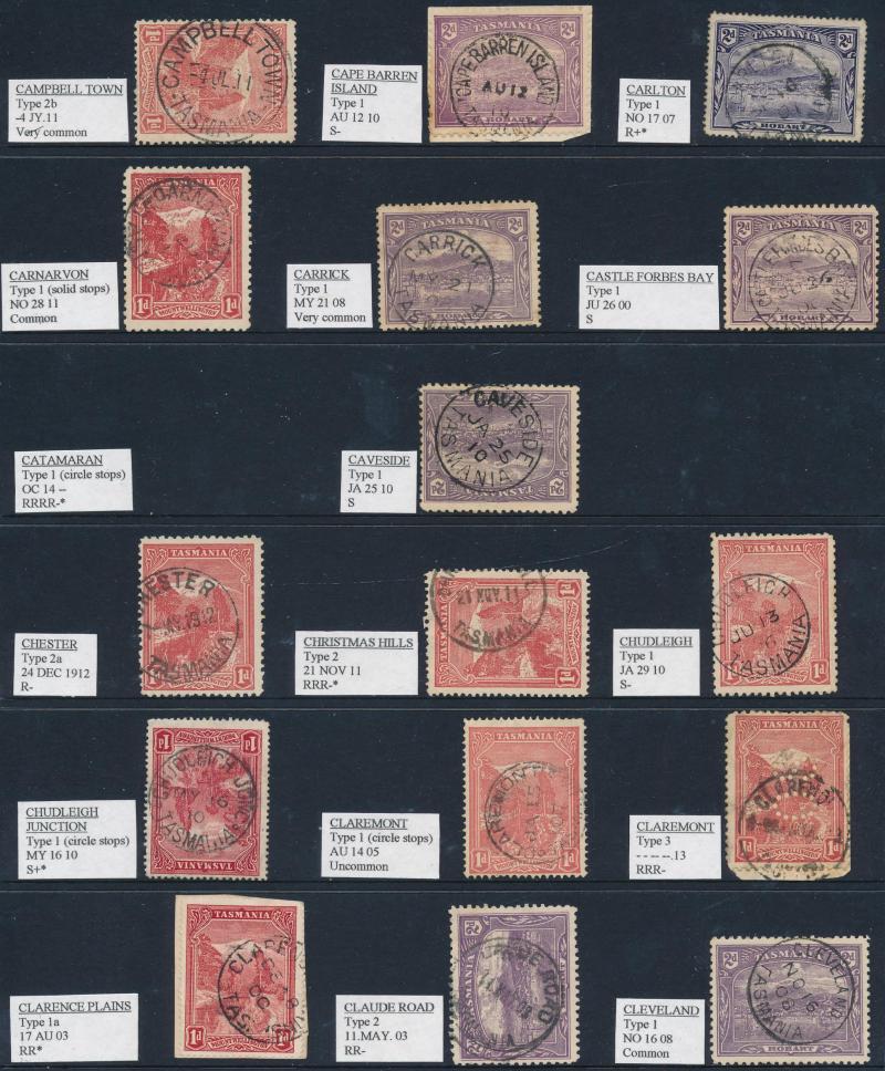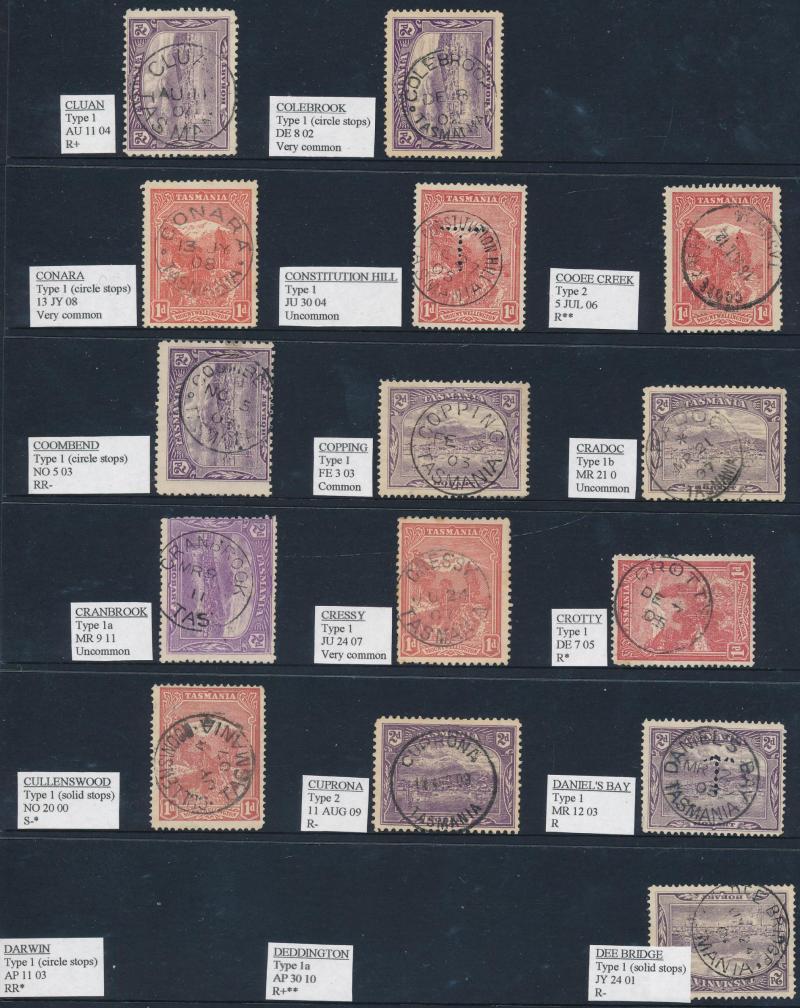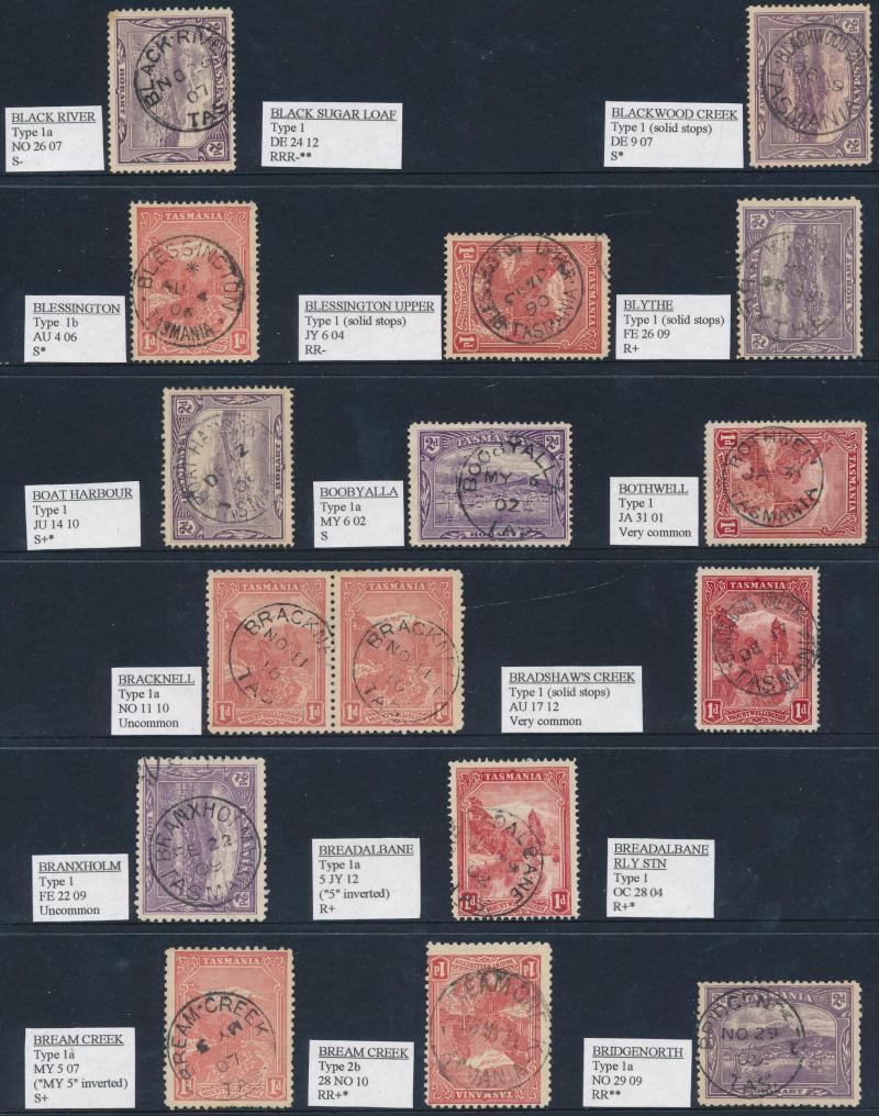 including 'BLACK BRUSH', 'BLESSINGTON UPPER', 'BREAM CREEK' Type 2b, 'BRIDGENORTH', 'CLARENCE PLAINS', 'DARWIN', 'FARRELL SI[DING]', 'GRAVELLY BEACH' Type 2b 1911 on ½d, 'KING RIVER' 1901, 'LIENNA', 'LOIRA', 'LOWER TURNER'S MARSH', 'MOINA',