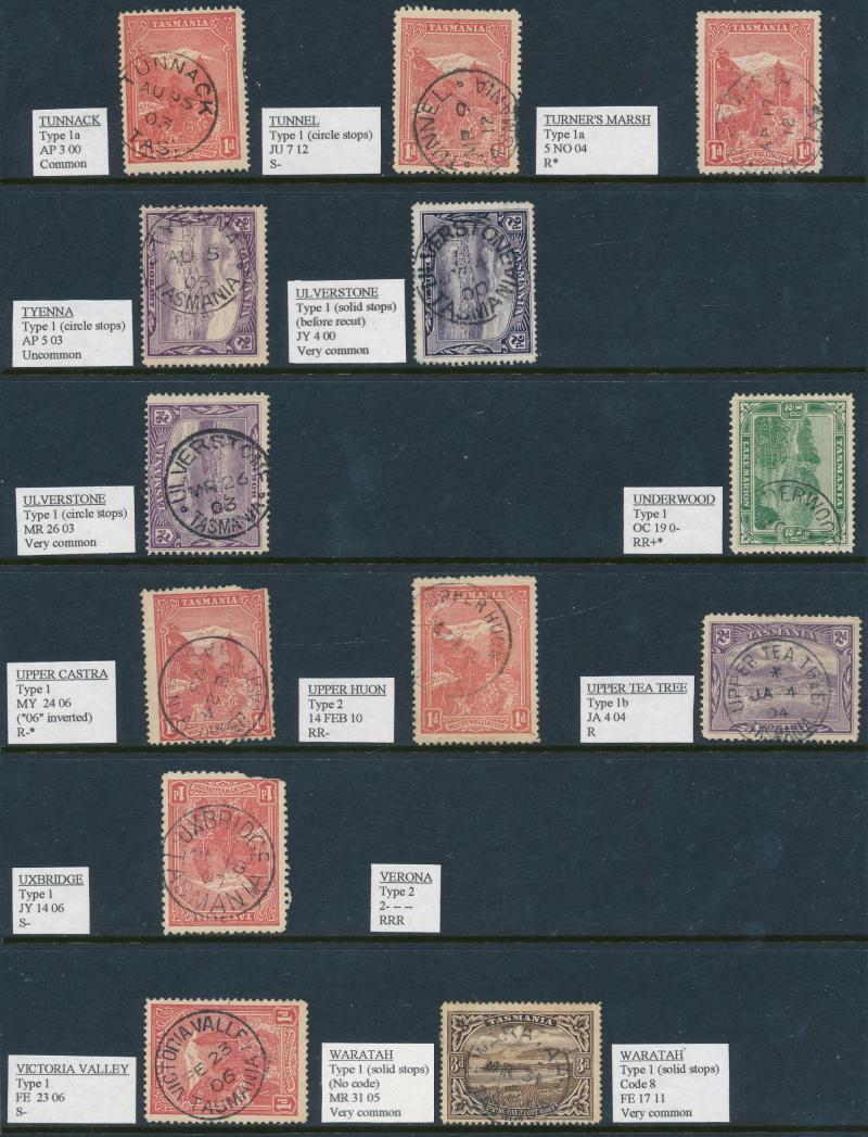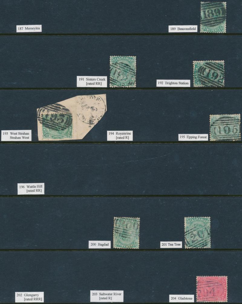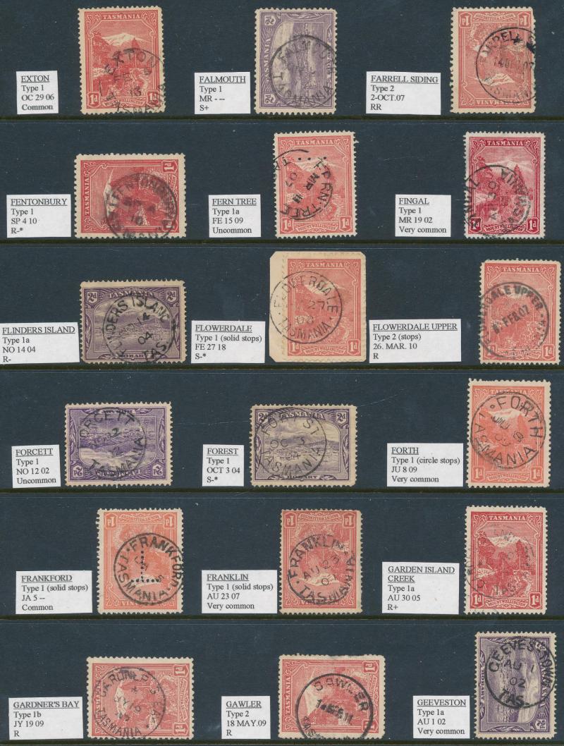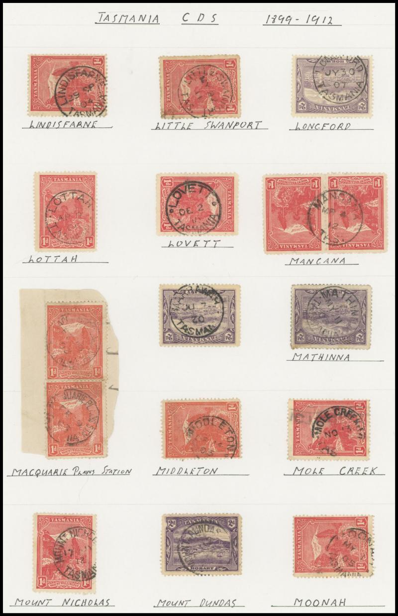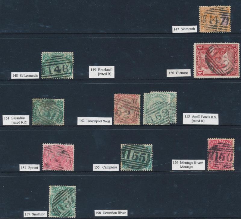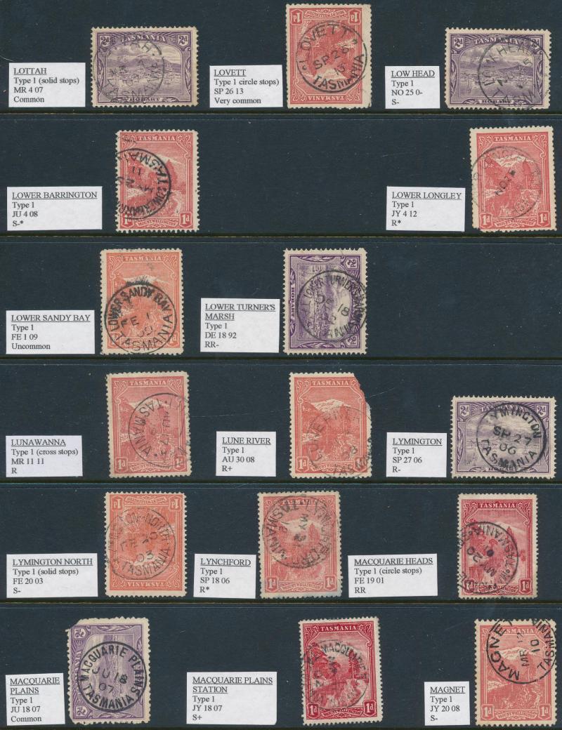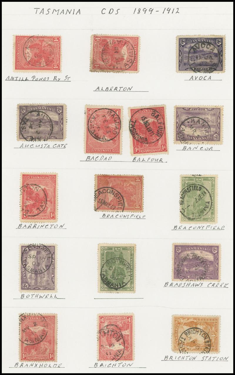 including 'BLACK BRUSH', 'BLESSINGTON UPPER', 'BREAM CREEK' Type 2b, 'BRIDGENORTH', 'CLARENCE PLAINS', 'DARWIN', 'FARRELL SI[DING]', 'GRAVELLY BEACH' Type 2b 1911 on ½d, 'KING RIVER' 1901, 'LIENNA', 'LOIRA', 'LOWER TURNER'S MARSH', 'MOINA',