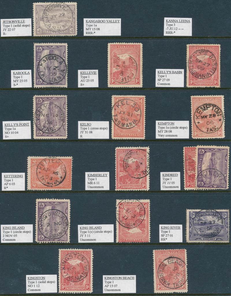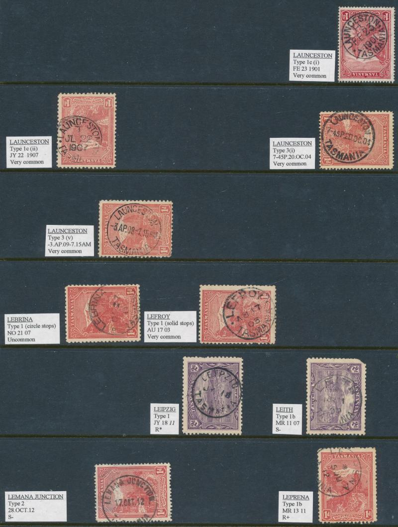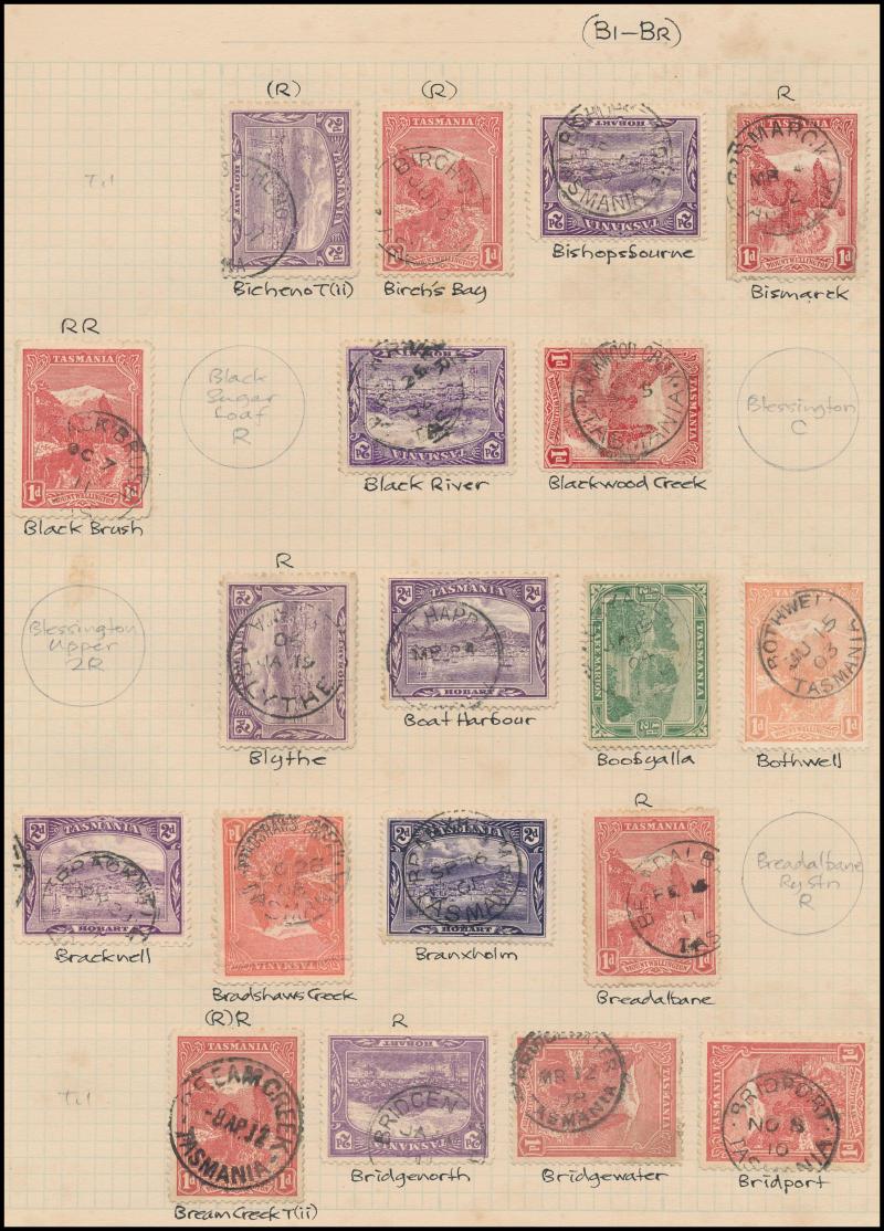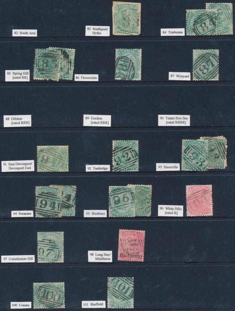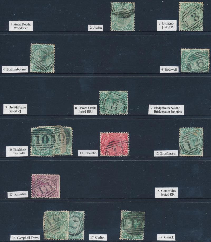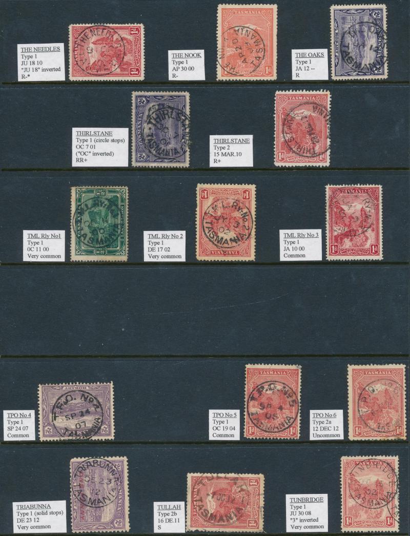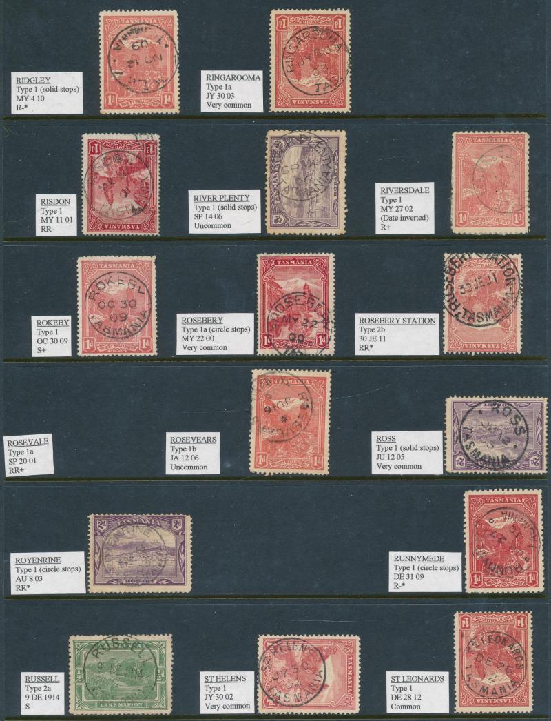including 'BLACK BRUSH', 'BLESSINGTON UPPER', 'BREAM CREEK' Type 2b, 'BRIDGENORTH', 'CLARENCE PLAINS', 'DARWIN', 'FARRELL SI[DING]', 'GRAVELLY BEACH' Type 2b 1911 on ½d, 'KING RIVER' 1901, 'LIENNA', 'LOIRA', 'LOWER TURNER'S MARSH', 'MOINA',
