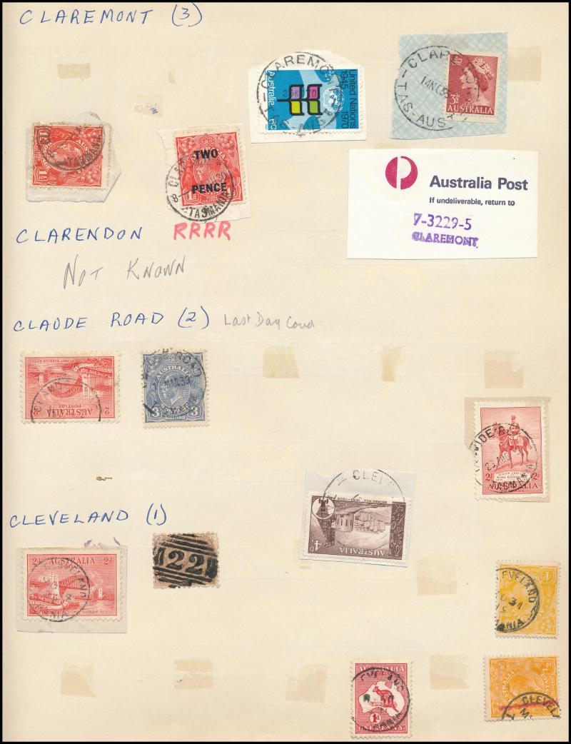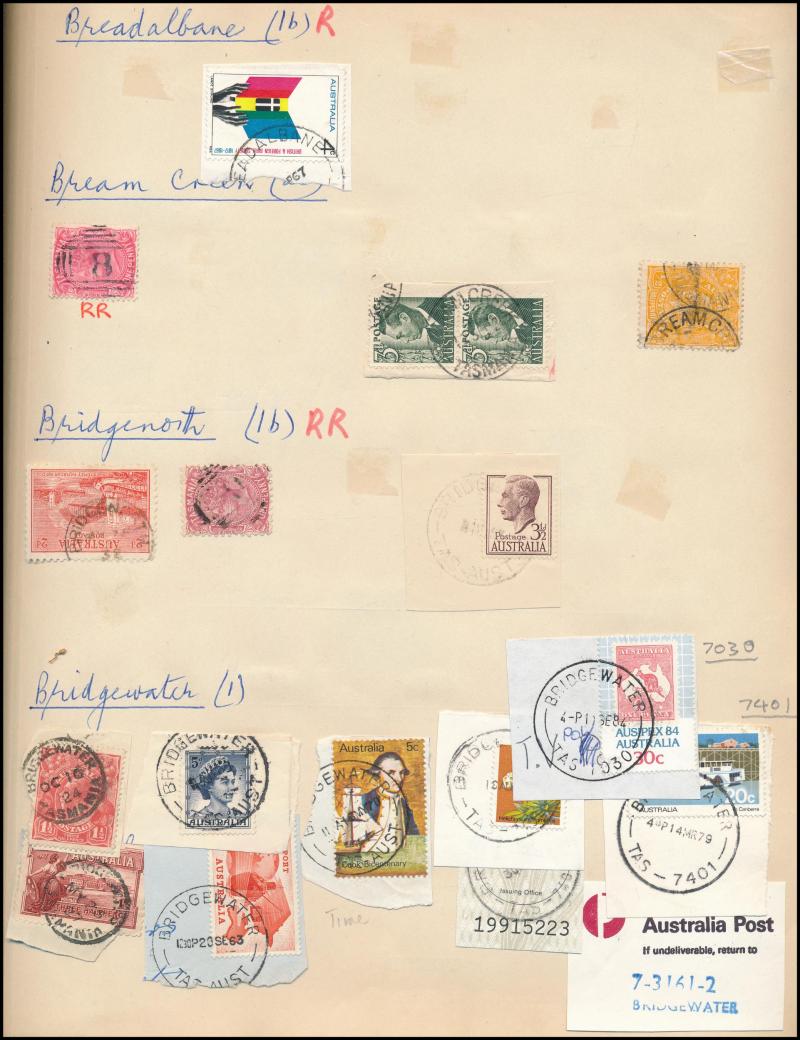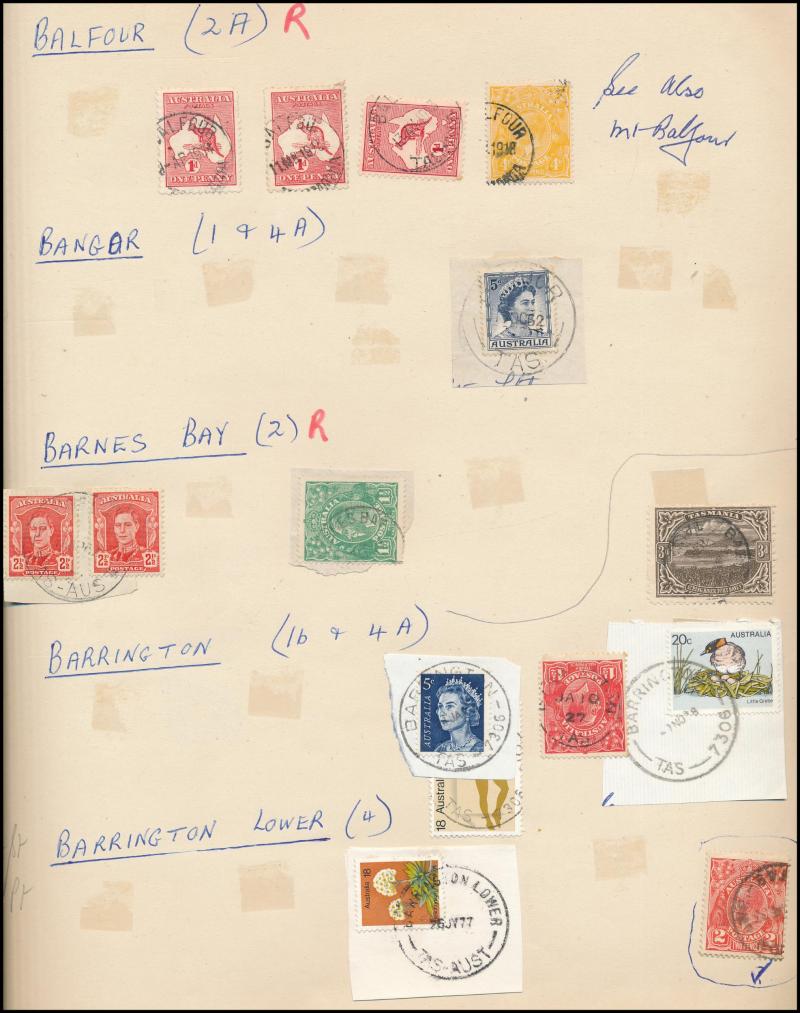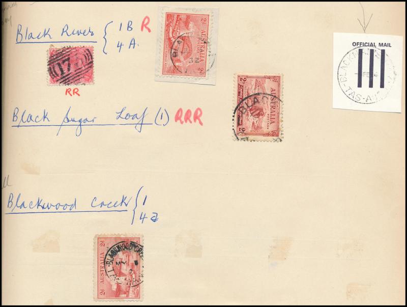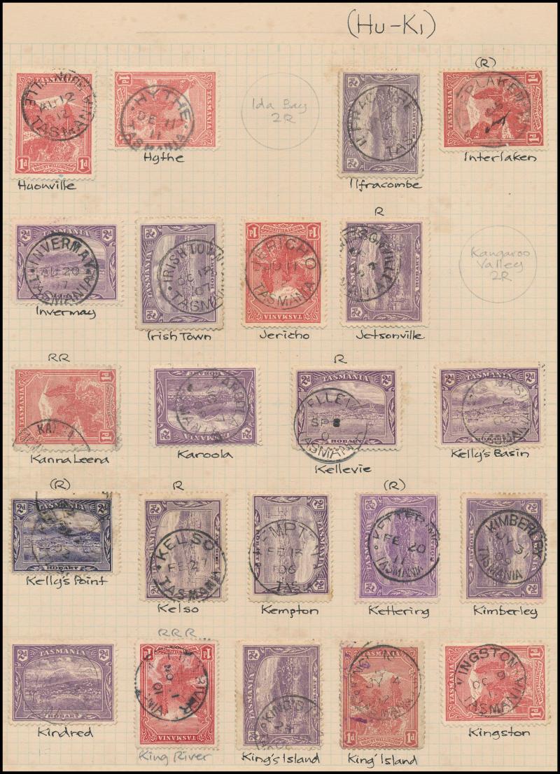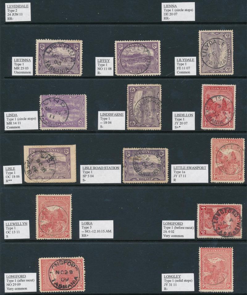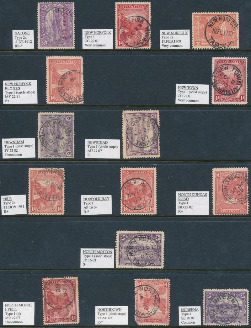 including 'BLACK BRUSH', 'BLESSINGTON UPPER', 'BREAM CREEK' Type 2b, 'BRIDGENORTH', 'CLARENCE PLAINS', 'DARWIN', 'FARRELL SI[DING]', 'GRAVELLY BEACH' Type 2b 1911 on ½d, 'KING RIVER' 1901, 'LIENNA', 'LOIRA', 'LOWER TURNER'S MARSH', 'MOINA',