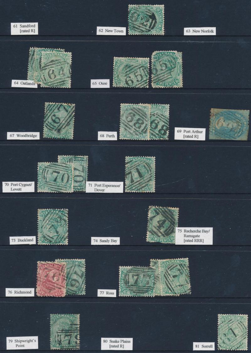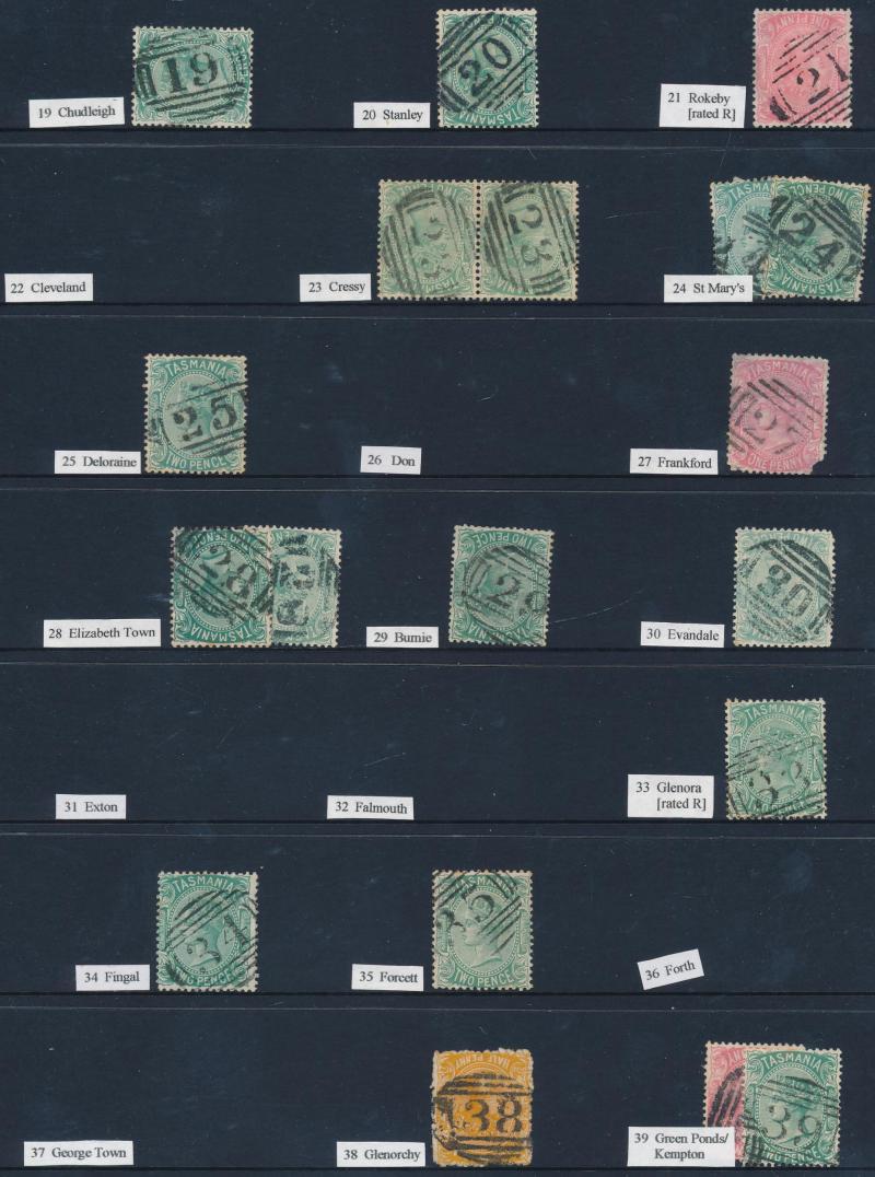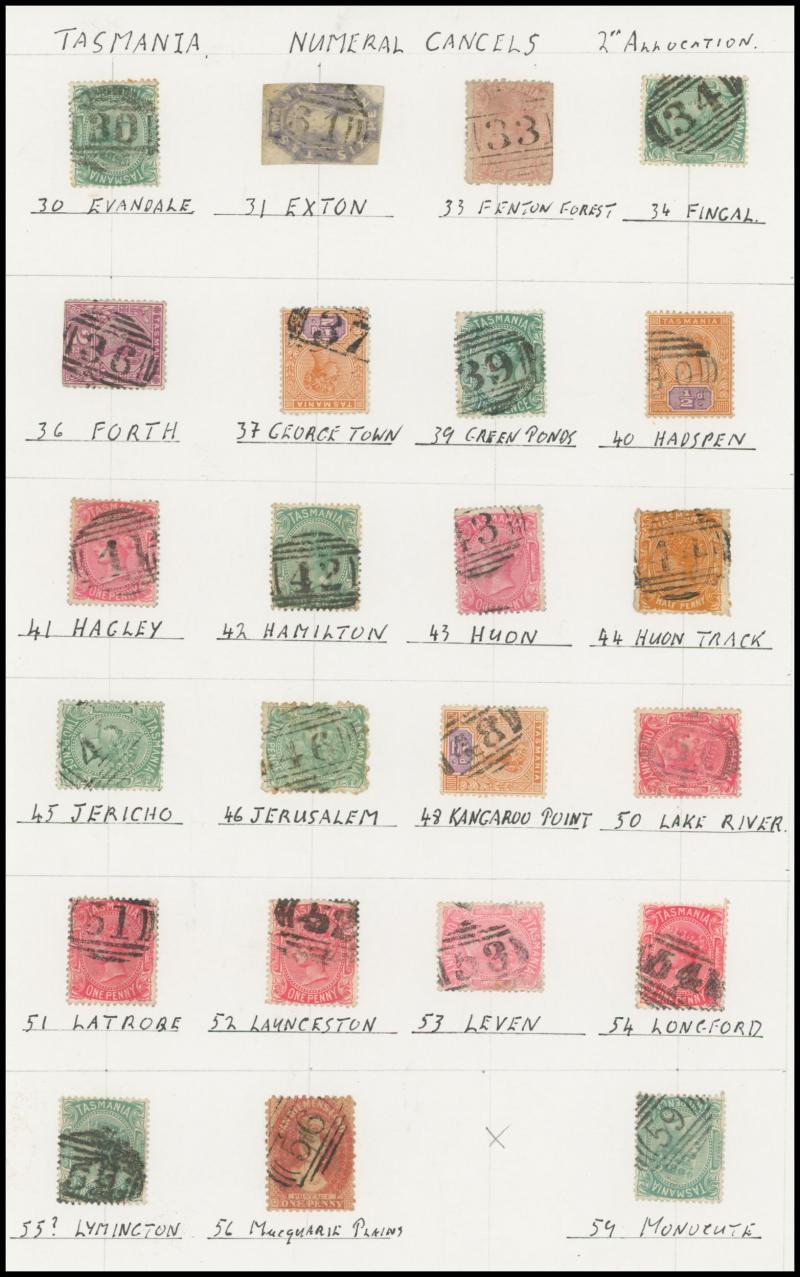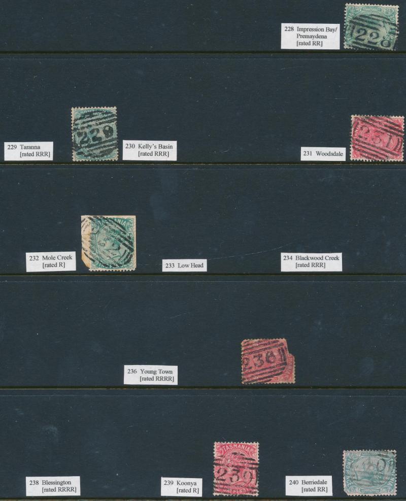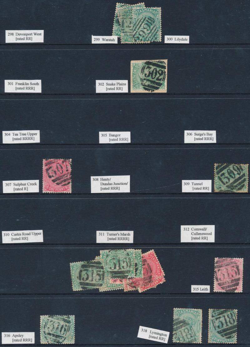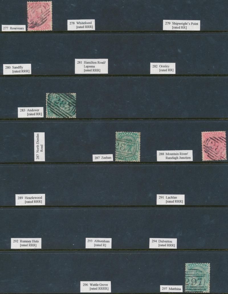 HILL', 'WHITEMORE', 'WILMOT LOWER', 'WOODLANDS', etc, and many very fine R-rated offices, higher values noted 'FLOWERDALE', '[FLO]WERDALE UPPER' & 'THIRLSTANE' each on 3d, 'CAPE BARREN ISLAND' & 'GOULDS COUNTRY' each on 4d, 'HAMILTON' on 5d, and