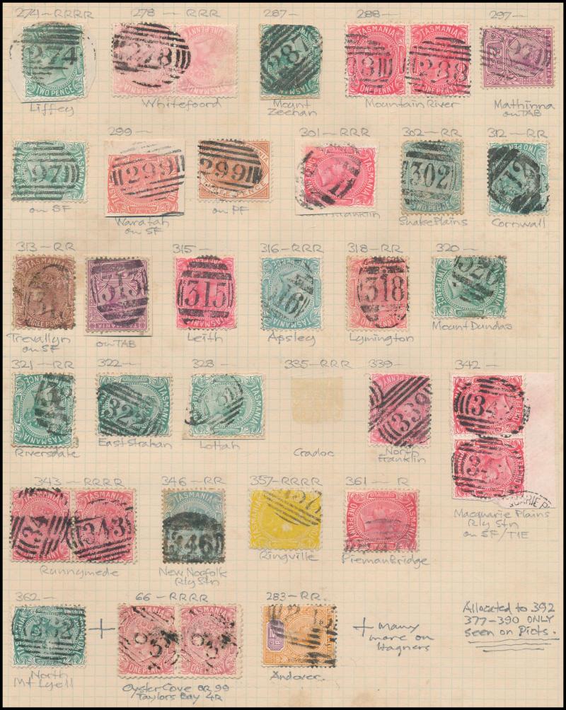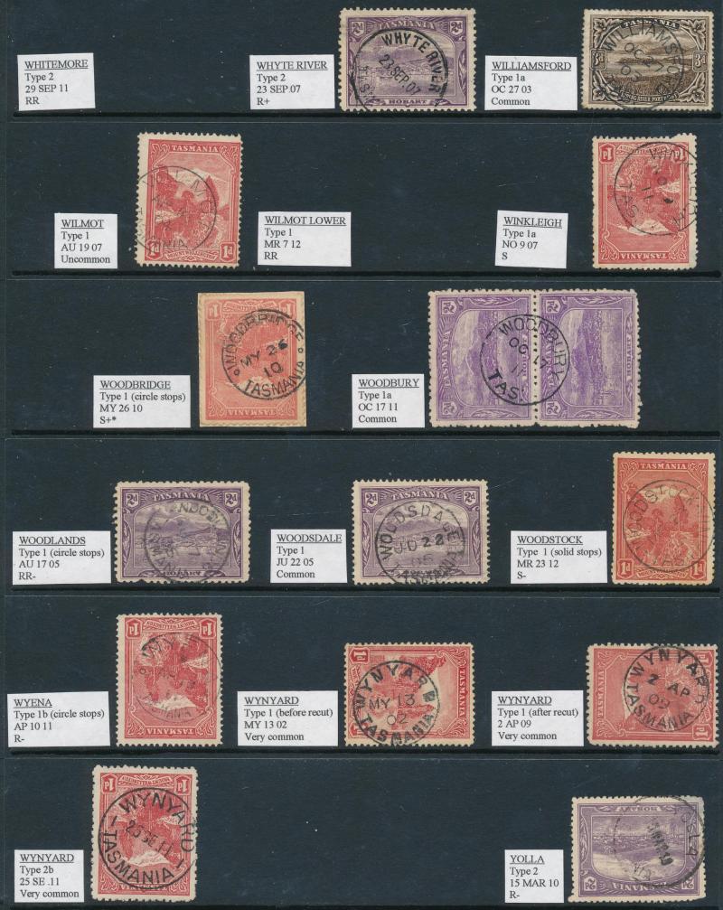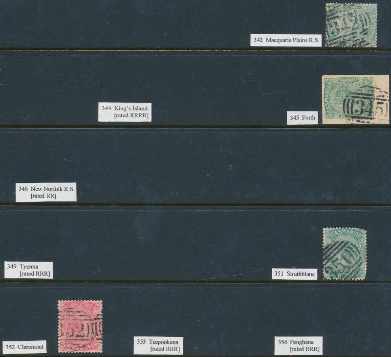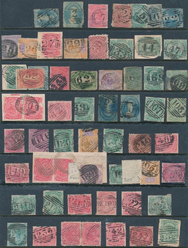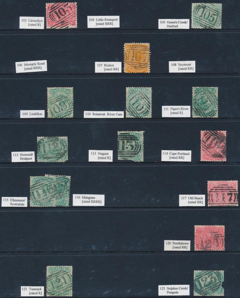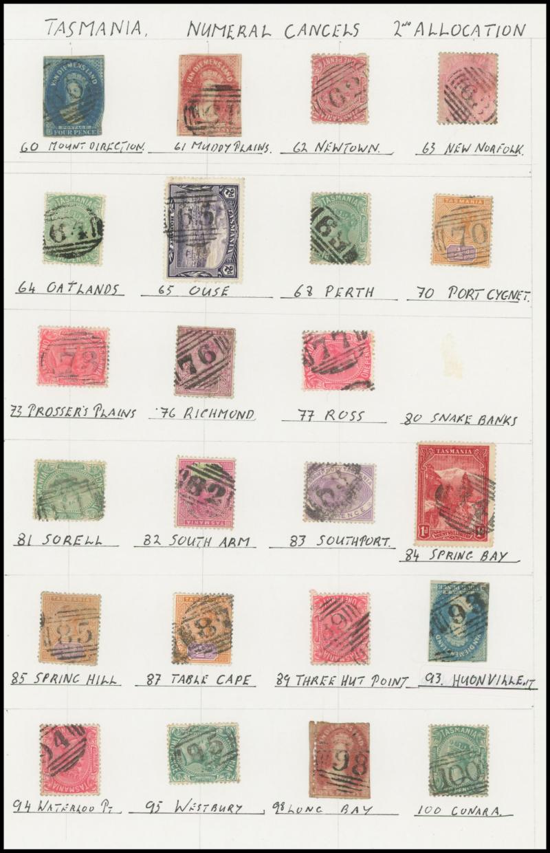 HILL', 'WHITEMORE', 'WILMOT LOWER', 'WOODLANDS', etc, and many very fine R-rated offices, higher values noted 'FLOWERDALE', '[FLO]WERDALE UPPER' & 'THIRLSTANE' each on 3d, 'CAPE BARREN ISLAND' & 'GOULDS COUNTRY' each on 4d, 'HAMILTON' on 5d, and