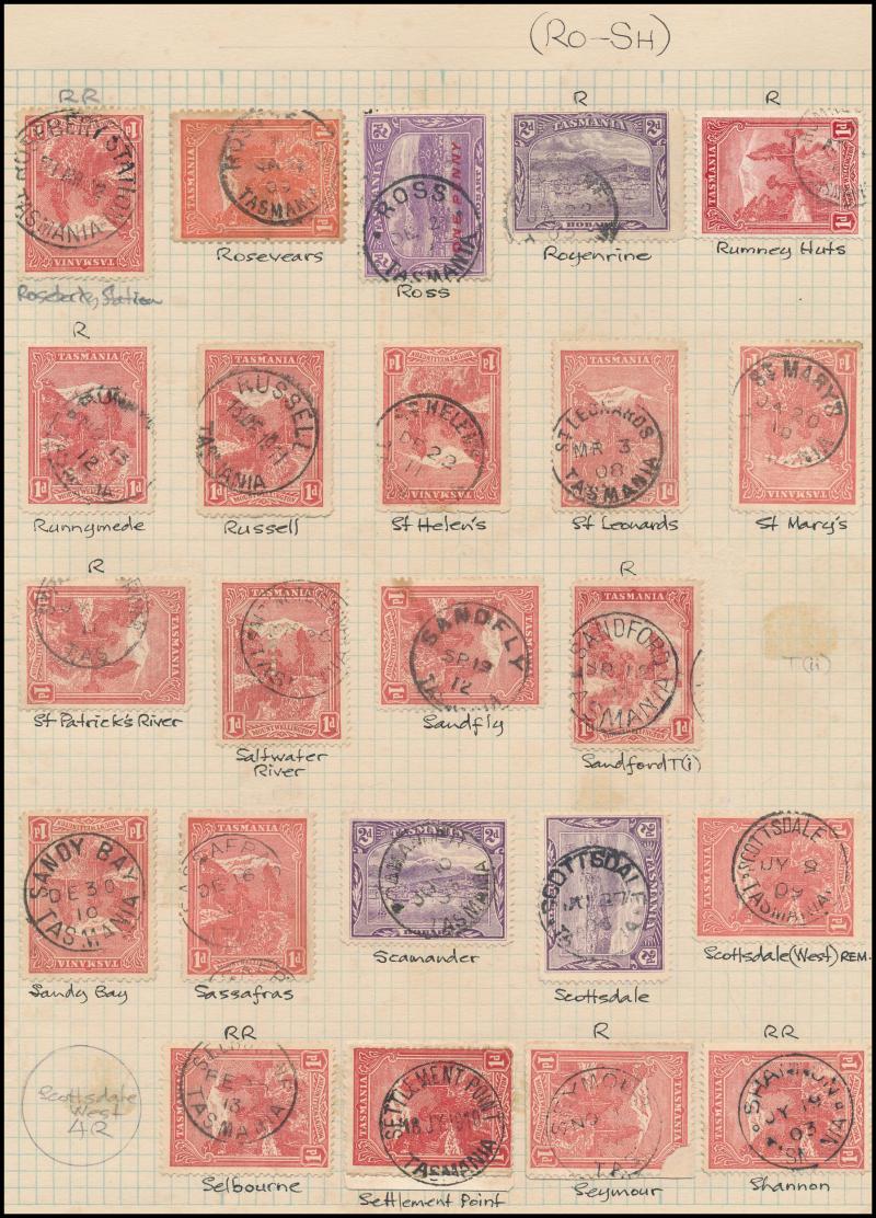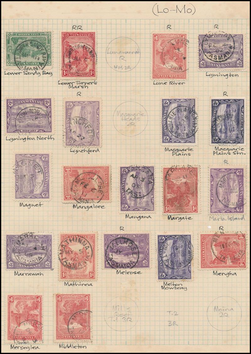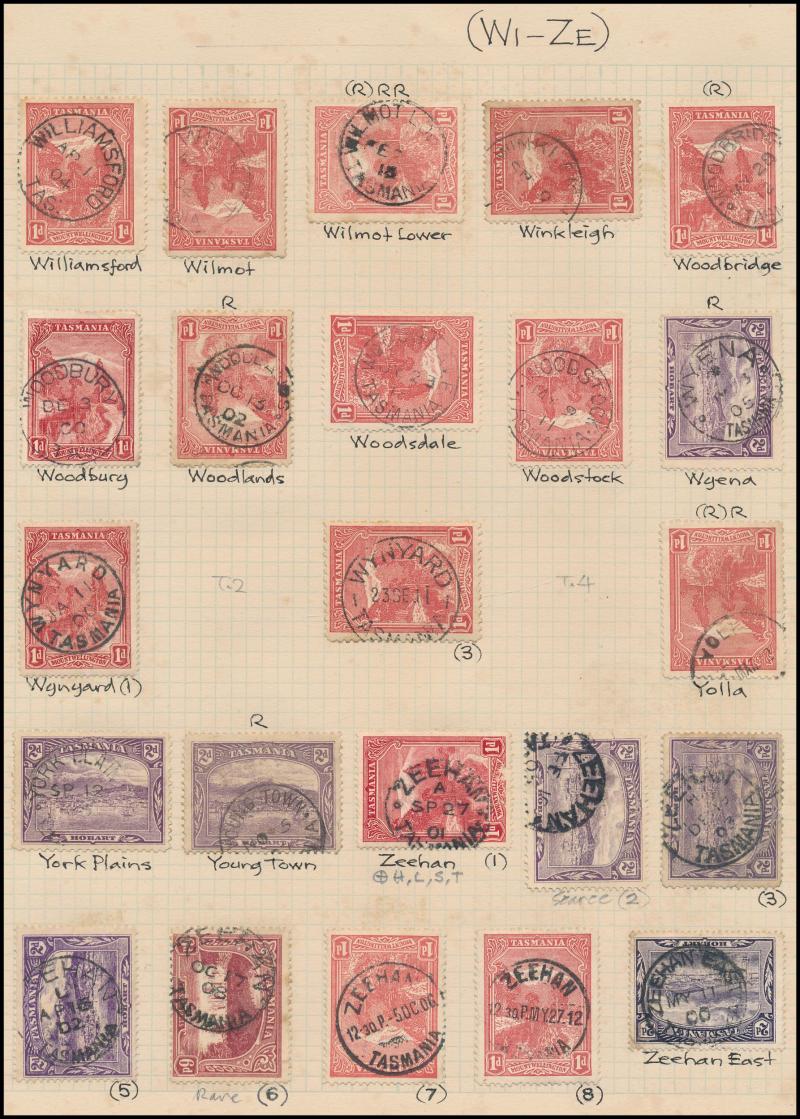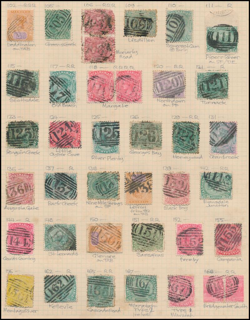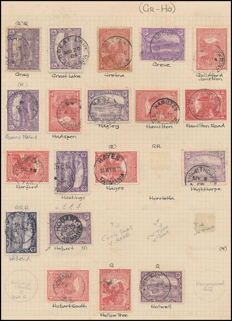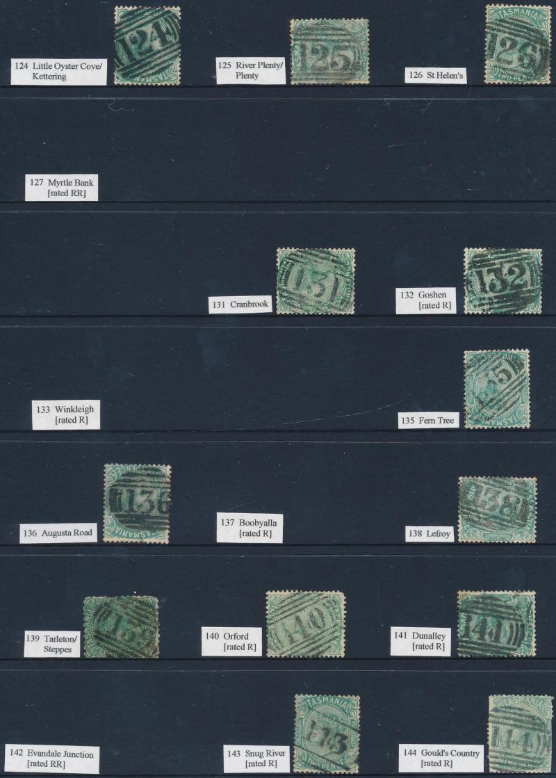 HILL', 'WHITEMORE', 'WILMOT LOWER', 'WOODLANDS', etc, and many very fine R-rated offices, higher values noted 'FLOWERDALE', '[FLO]WERDALE UPPER' & 'THIRLSTANE' each on 3d, 'CAPE BARREN ISLAND' & 'GOULDS COUNTRY' each on 4d, 'HAMILTON' on 5d, and