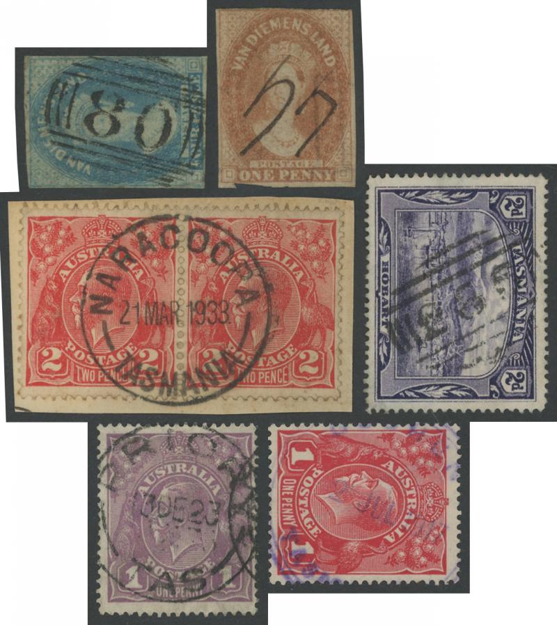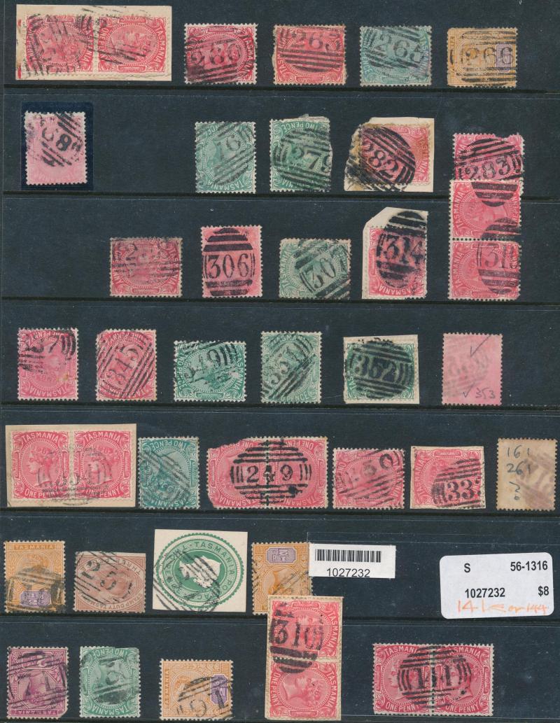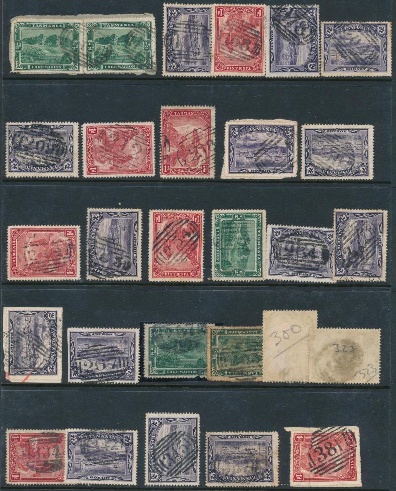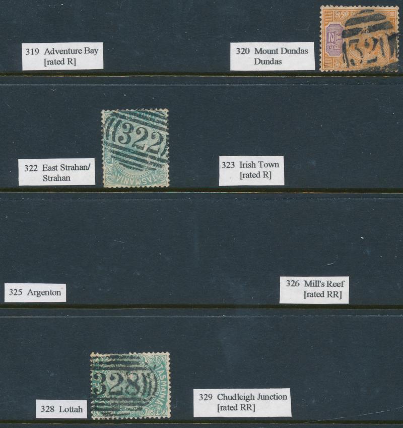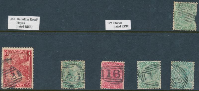 '309' of Tunnel, '316' of Apsley, '318' of Lymington x2, R-rated '49' of Kelly's Point on Postal Fiscal 1d Platypus pair, '69' of Port Arthur on 4d Chalon (trimmed perfs), '222' of Stowport on 1d Pictorial, '329' of Chudleigh Junction on 2d Pictorial