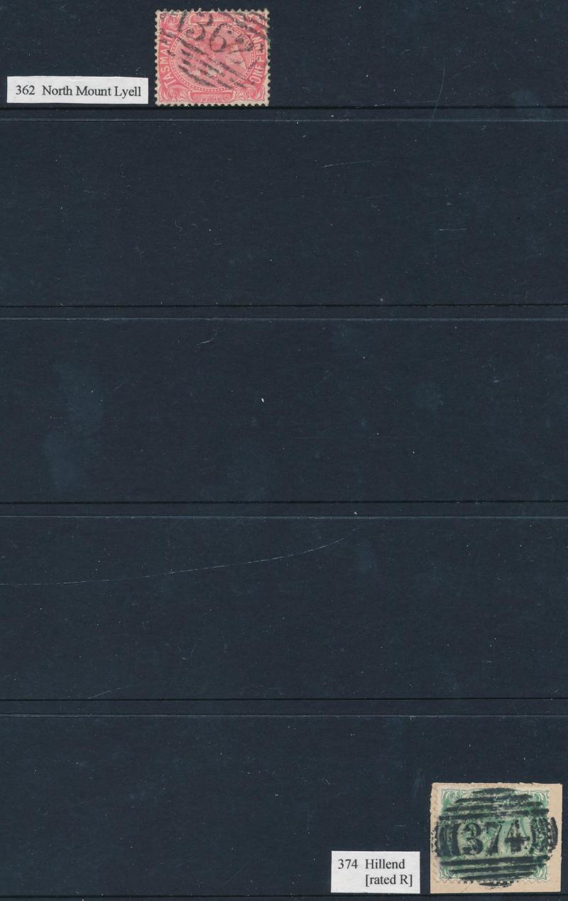noted '[MT] BALFOUR', 'GROVE', 'LITTLE SWANPORT', and a few Numerals noted manuscript "77" of Ross on 1d Imperf Chalon, '80' (rated RRR) of Snake Banks on 4d Imperf Chalon and '265' (RR) of Lowe's Bridge on 2d Pictorial, some postal history interest