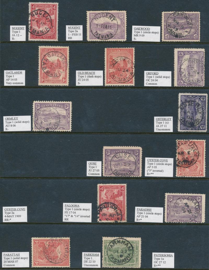 'NUGENT' Type 2 (superb), 'OYSTER COVE' Type 2a, 'PALOONA', 'RISDON', 'ROSE-VALE', 'ROSEBERY STATION', 'SELBOURNE', 'SHANNON', 'SOUTH PRESTON', 'STIRLING', 'STONEHENGE', 'SURGES BAY' Type 2a, 'THIRLSTANE' Type 1, 'UNDERWOOD', 'UPPER HUON', 'WATTLE