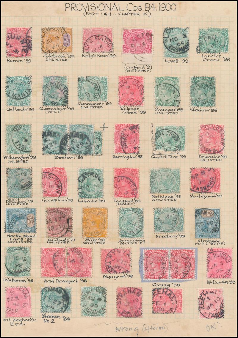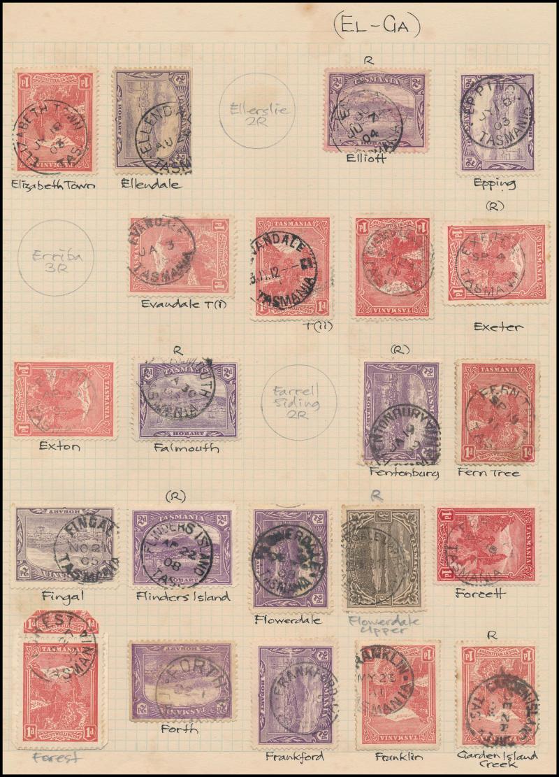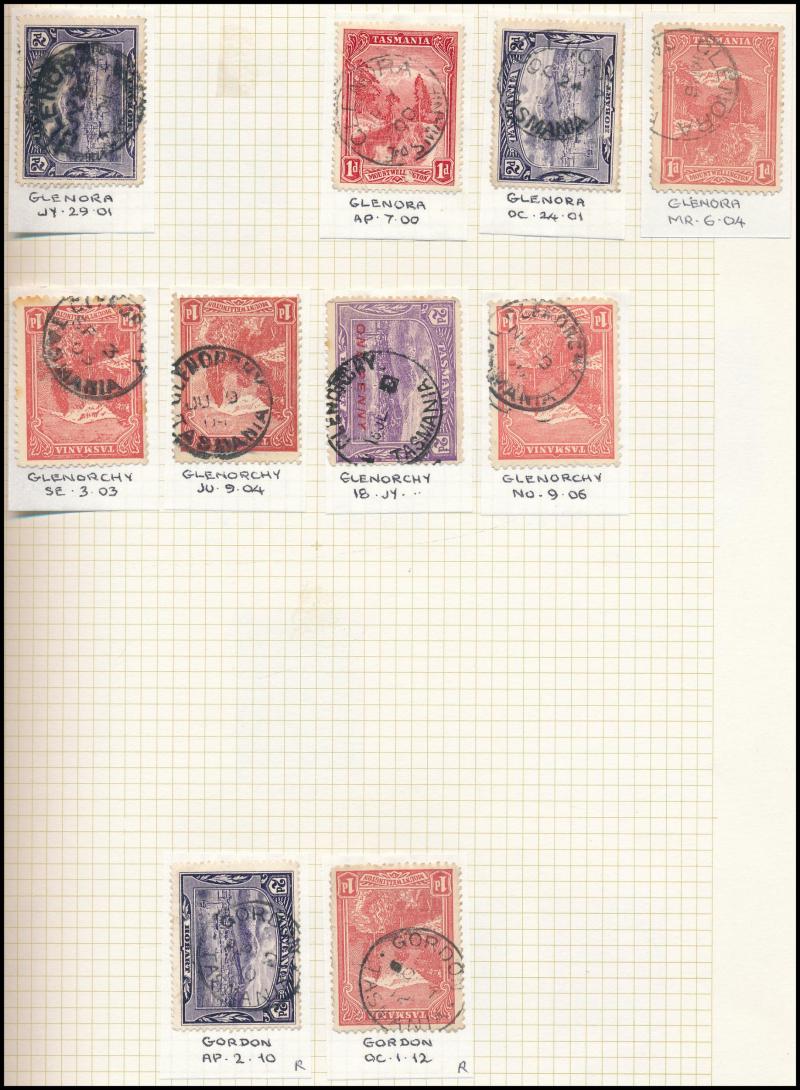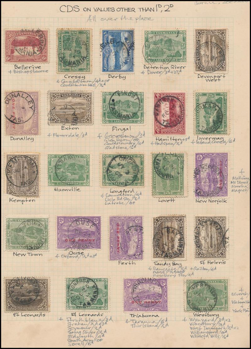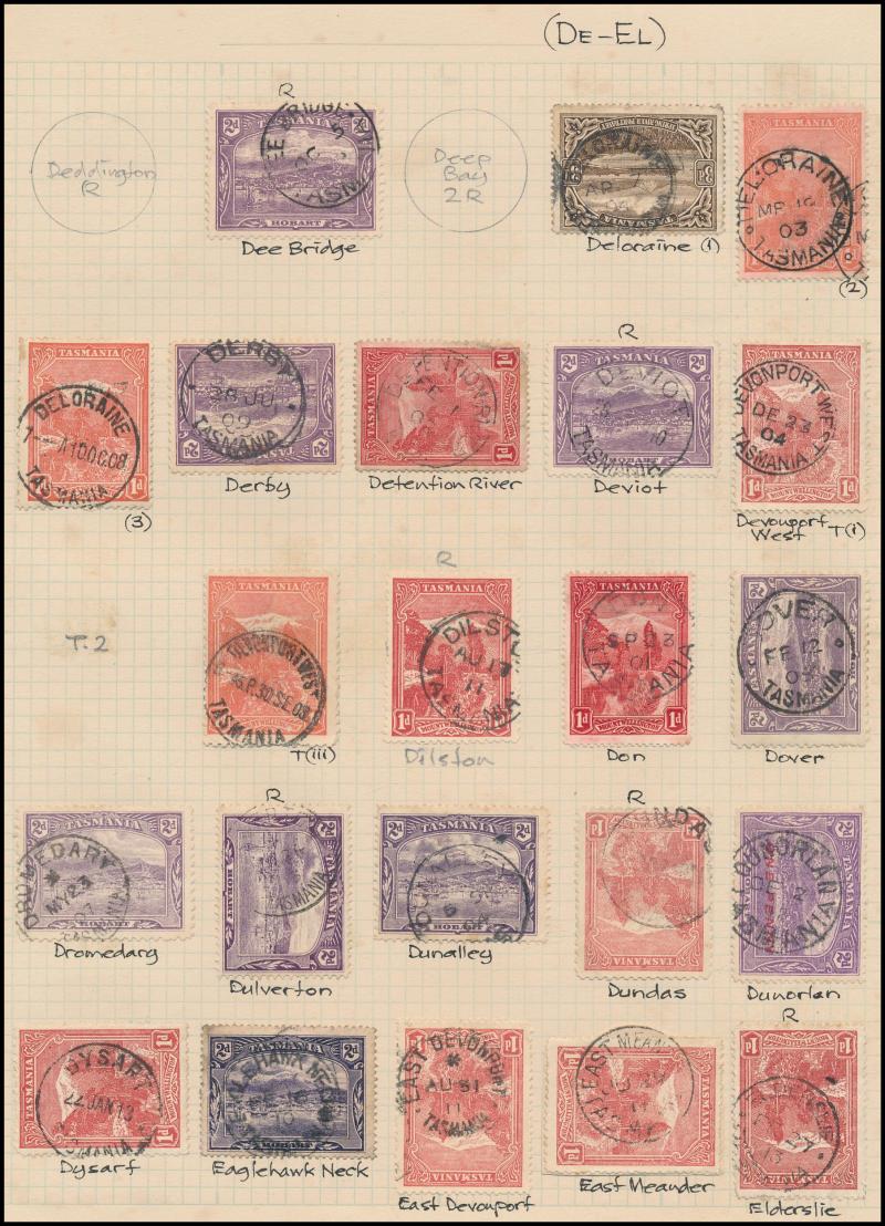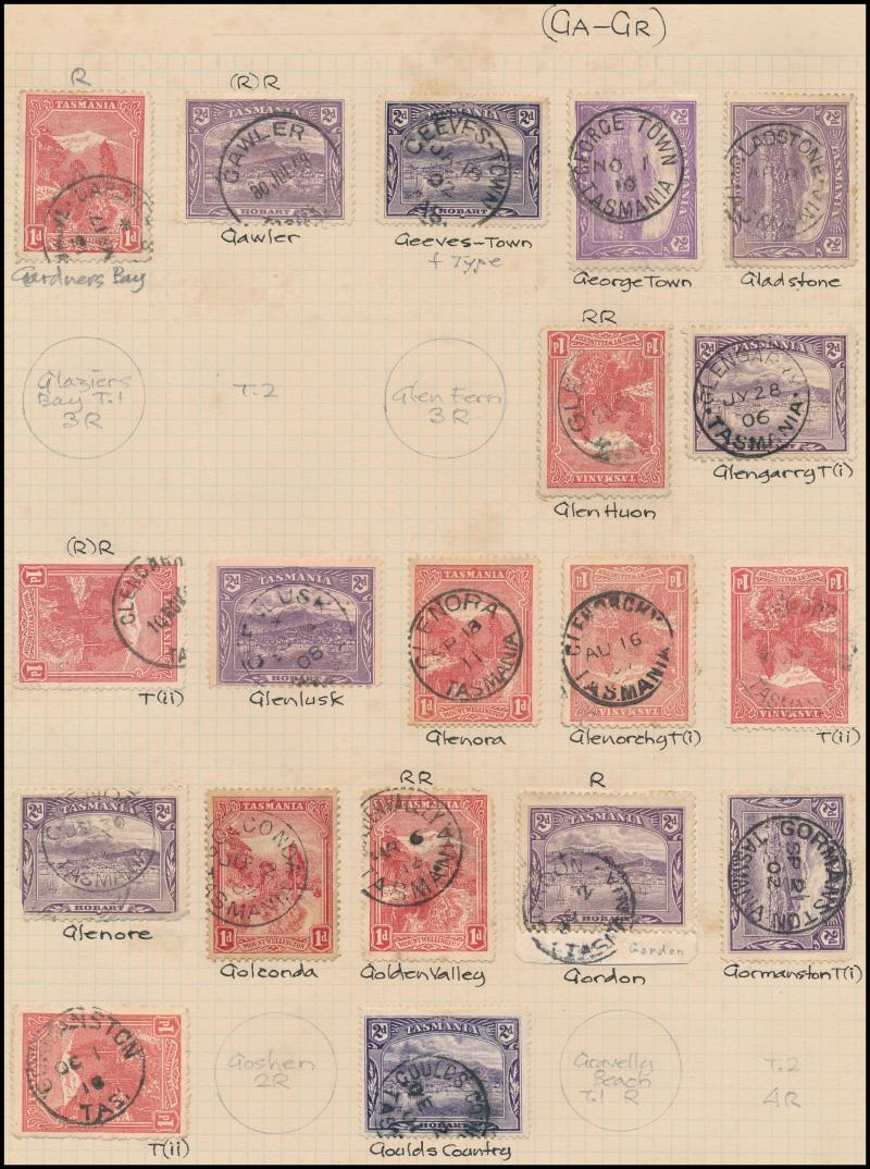 'GA[RDEN IS]LAND CREEK', 'GLADSTONE', 'SORELL' & 'TARANNA' each on 6d, also ERD & LRD section, 'abnormals' including Manuscript "Oldina" on 1d and "Myalla" & "Spreyton" on 2d, and a range of datestamps on other issues, the strikes a little variable