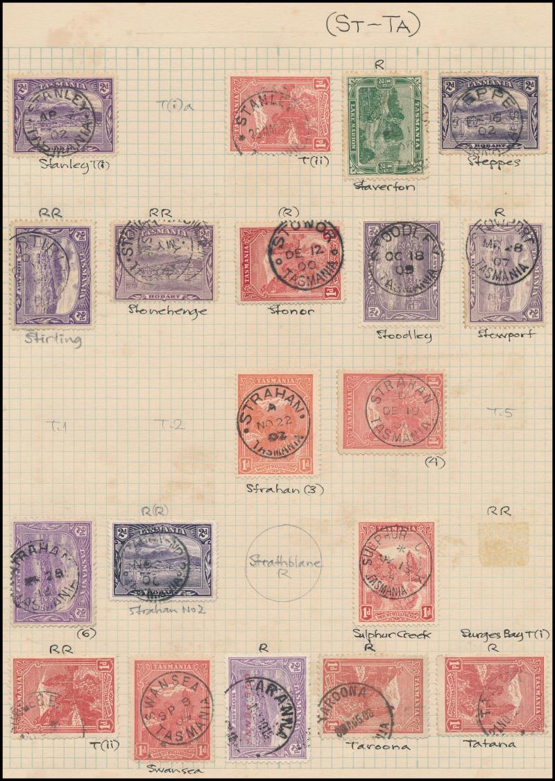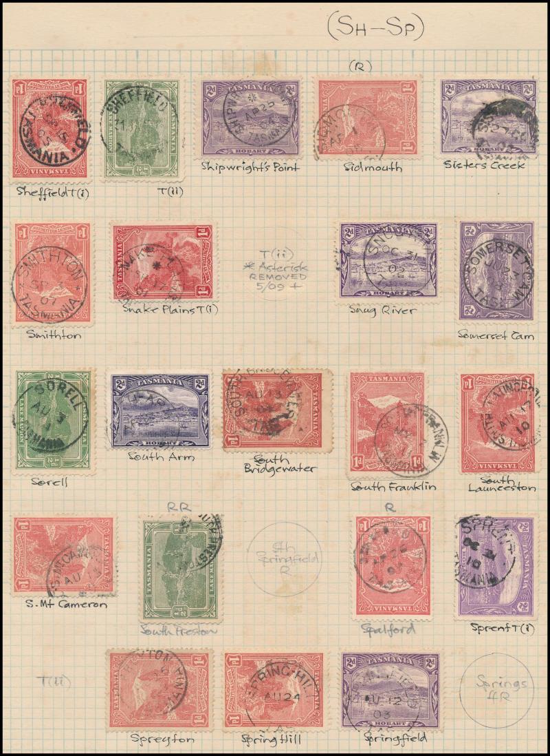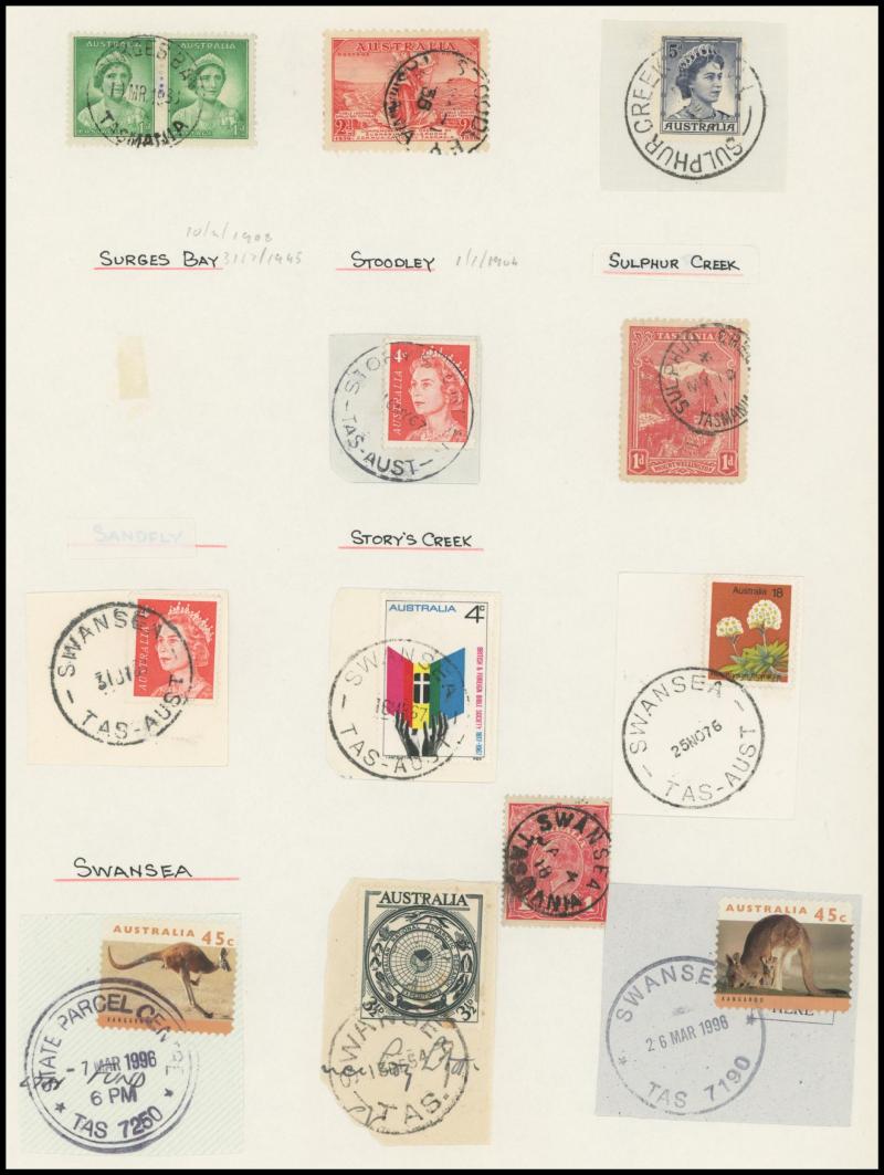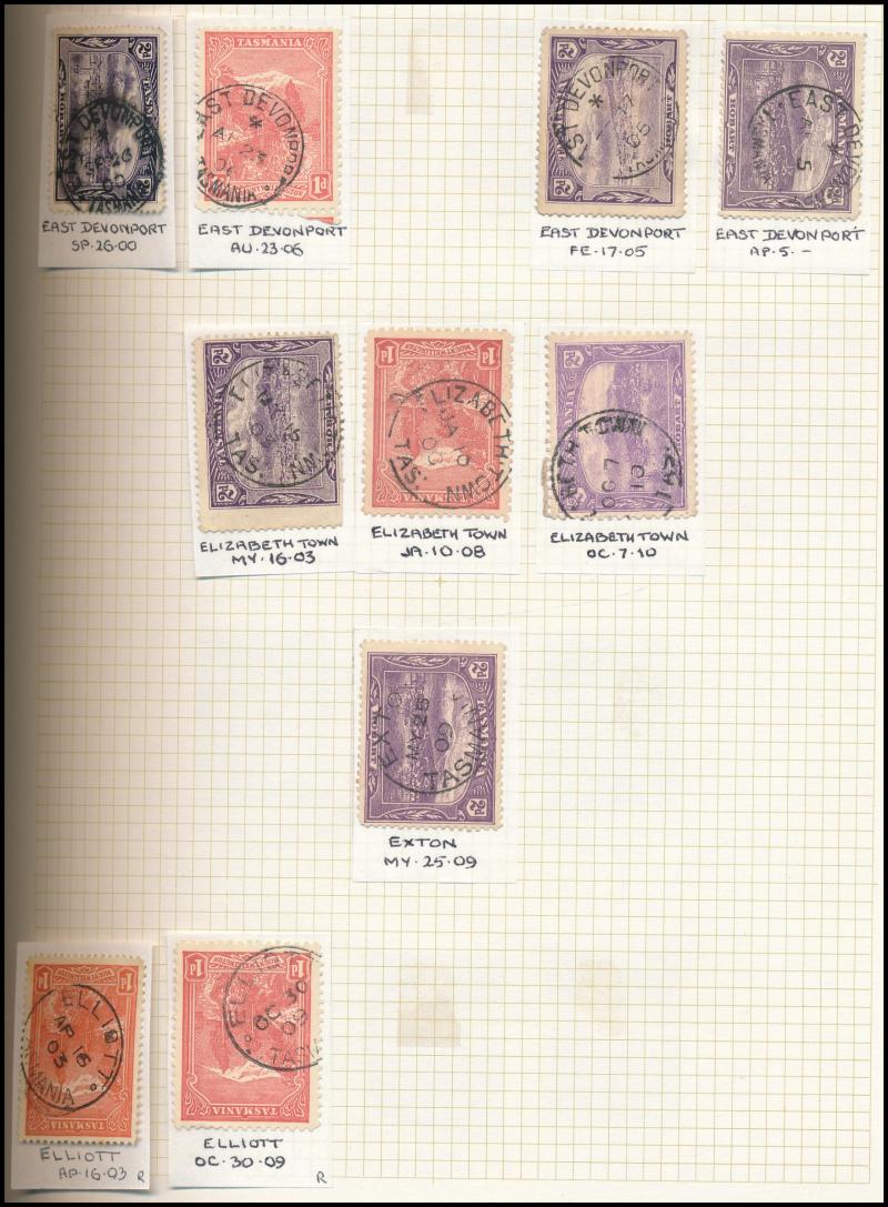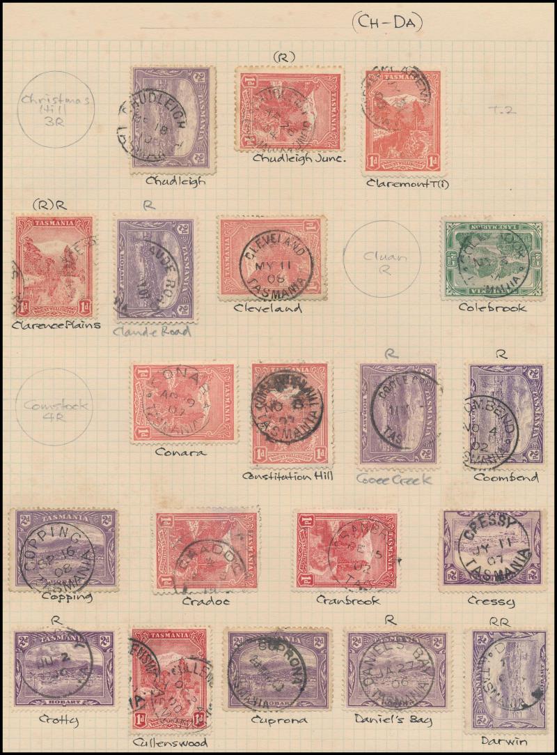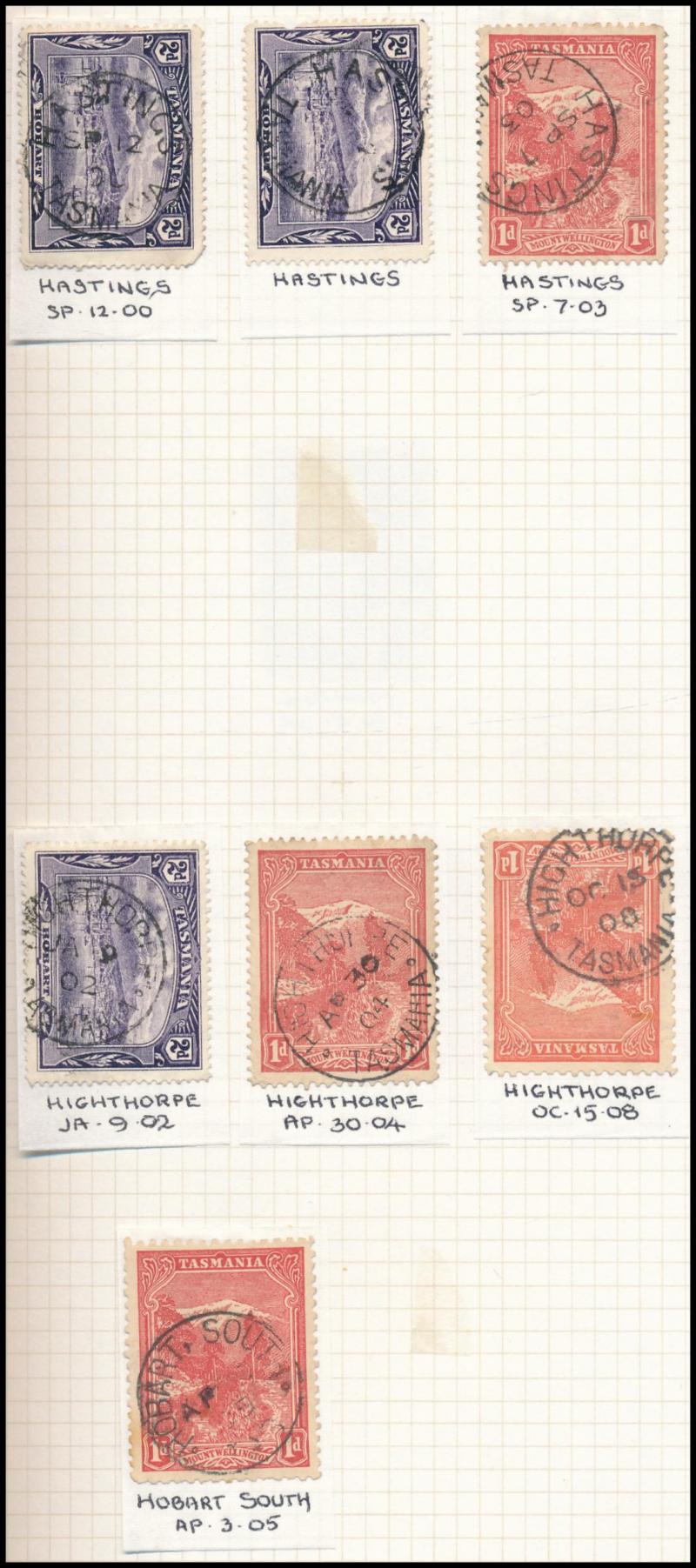 'GA[RDEN IS]LAND CREEK', 'GLADSTONE', 'SORELL' & 'TARANNA' each on 6d, also ERD & LRD section, 'abnormals' including Manuscript "Oldina" on 1d and "Myalla" & "Spreyton" on 2d, and a range of datestamps on other issues, the strikes a little variable
