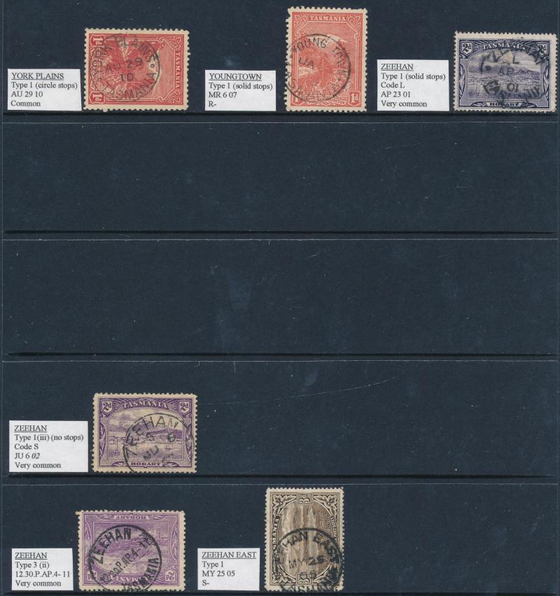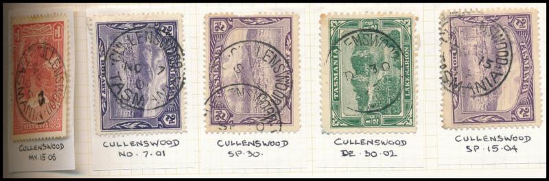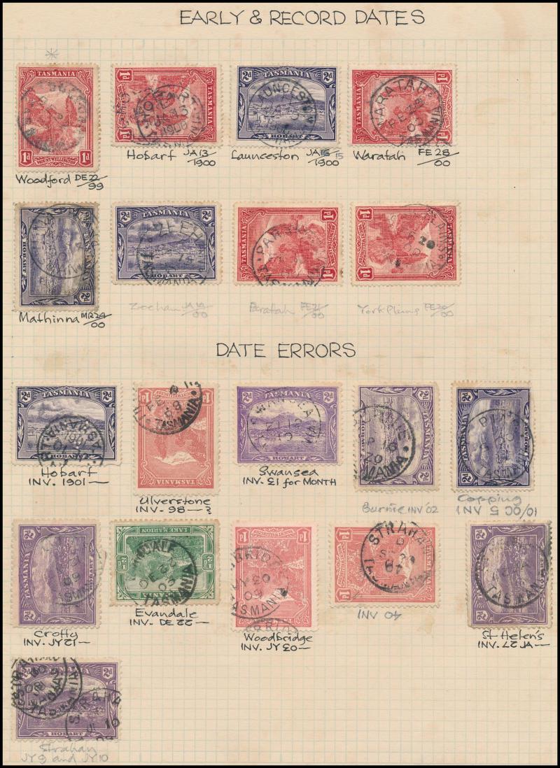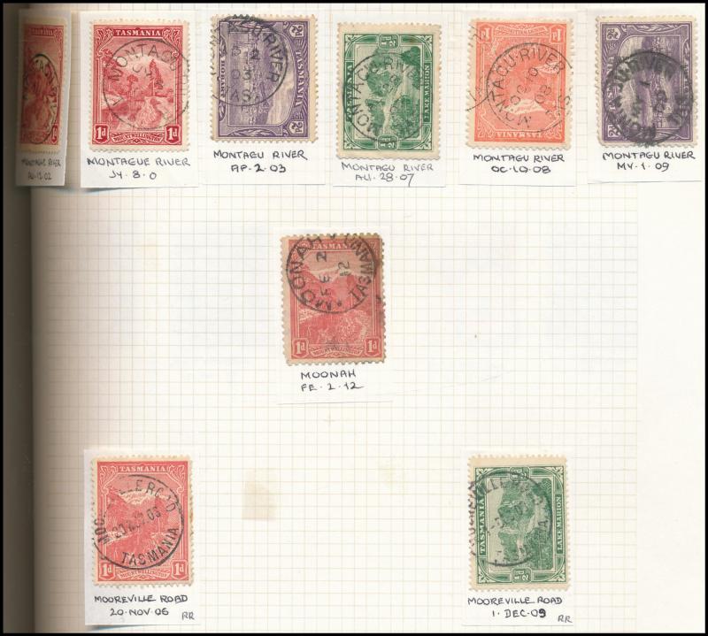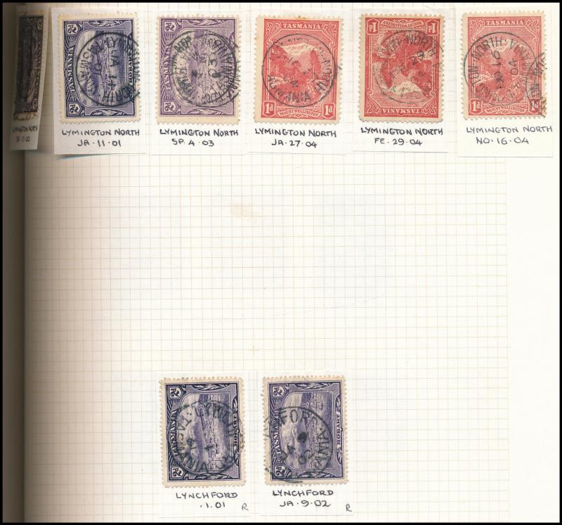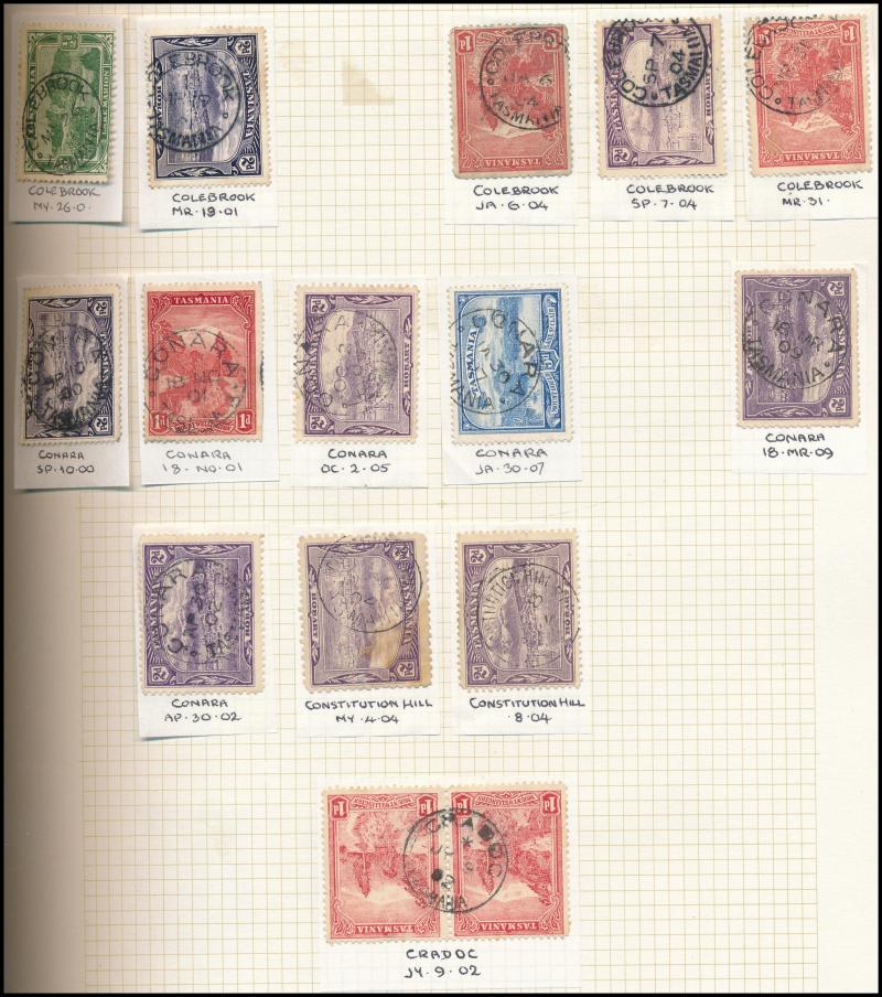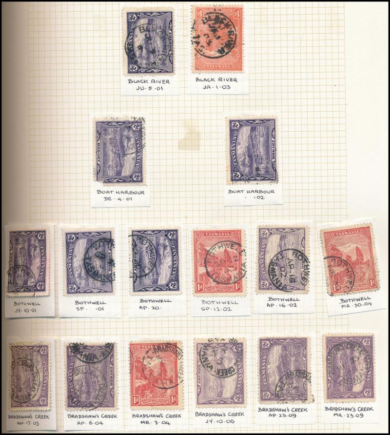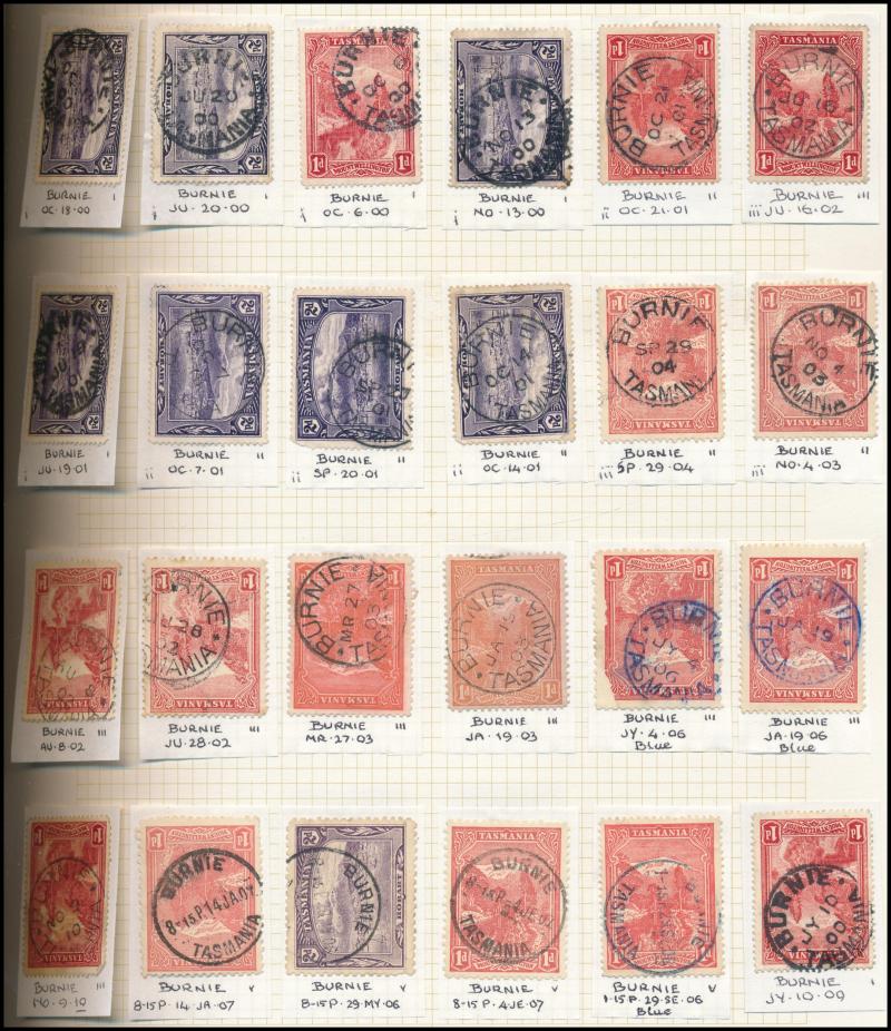'GA[RDEN IS]LAND CREEK', 'GLADSTONE', 'SORELL' & 'TARANNA' each on 6d, also ERD & LRD section, 'abnormals' including Manuscript "Oldina" on 1d and "Myalla" & "Spreyton" on 2d, and a range of datestamps on other issues, the strikes a little variable
