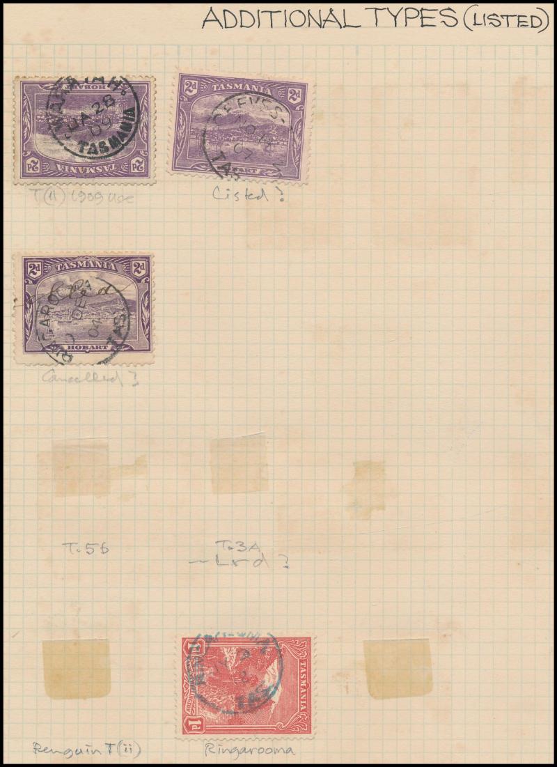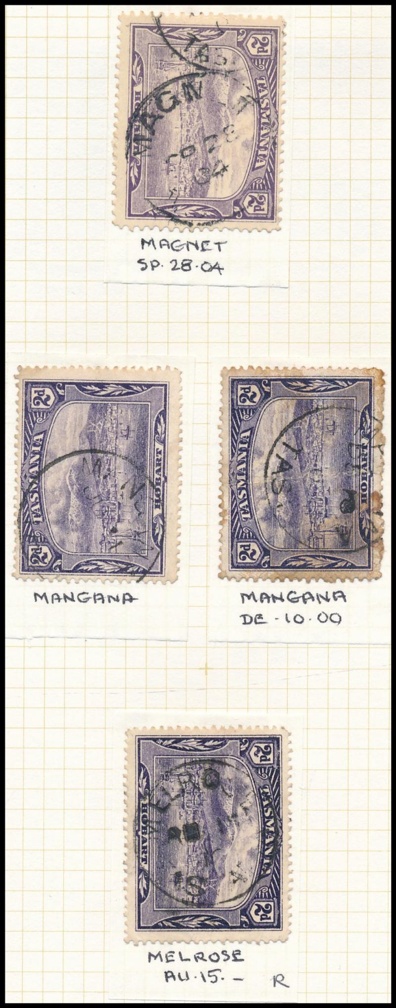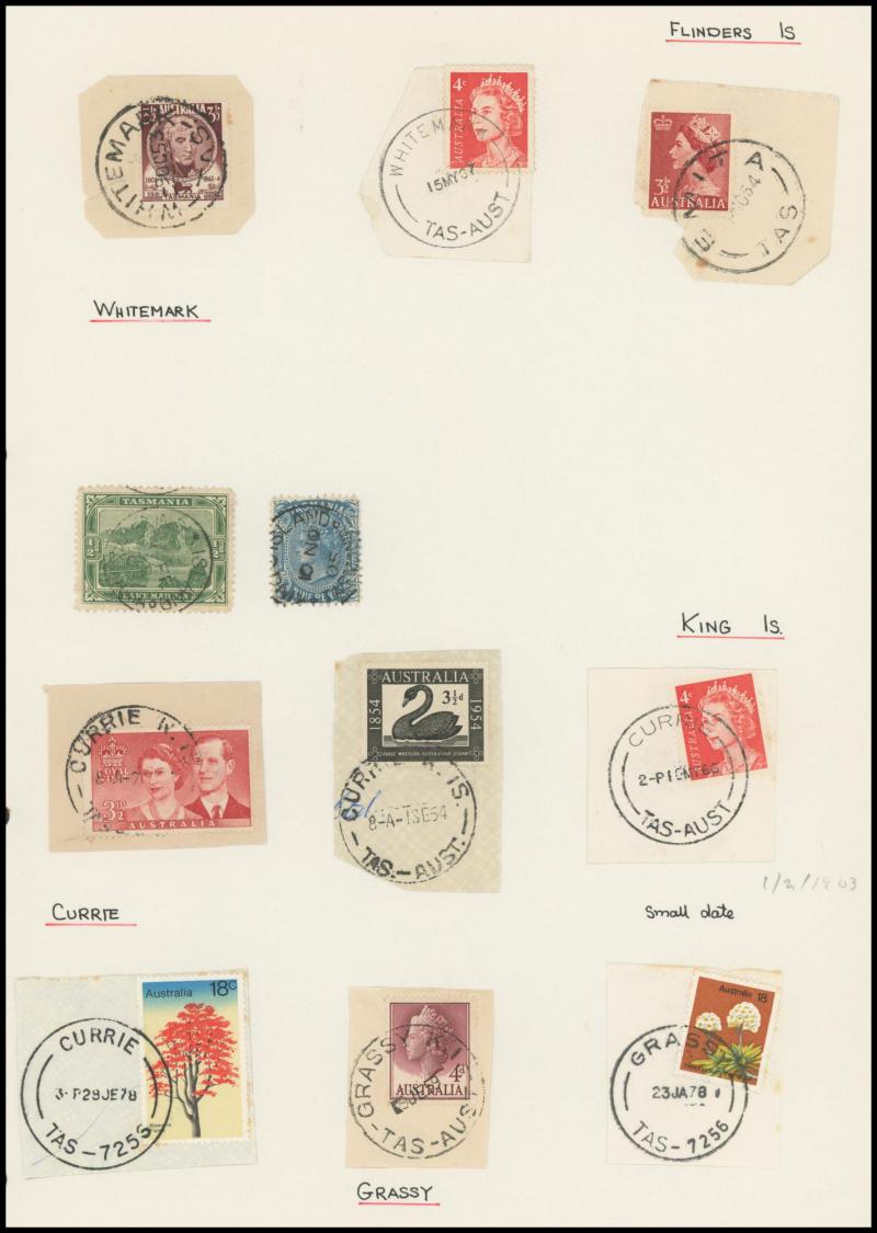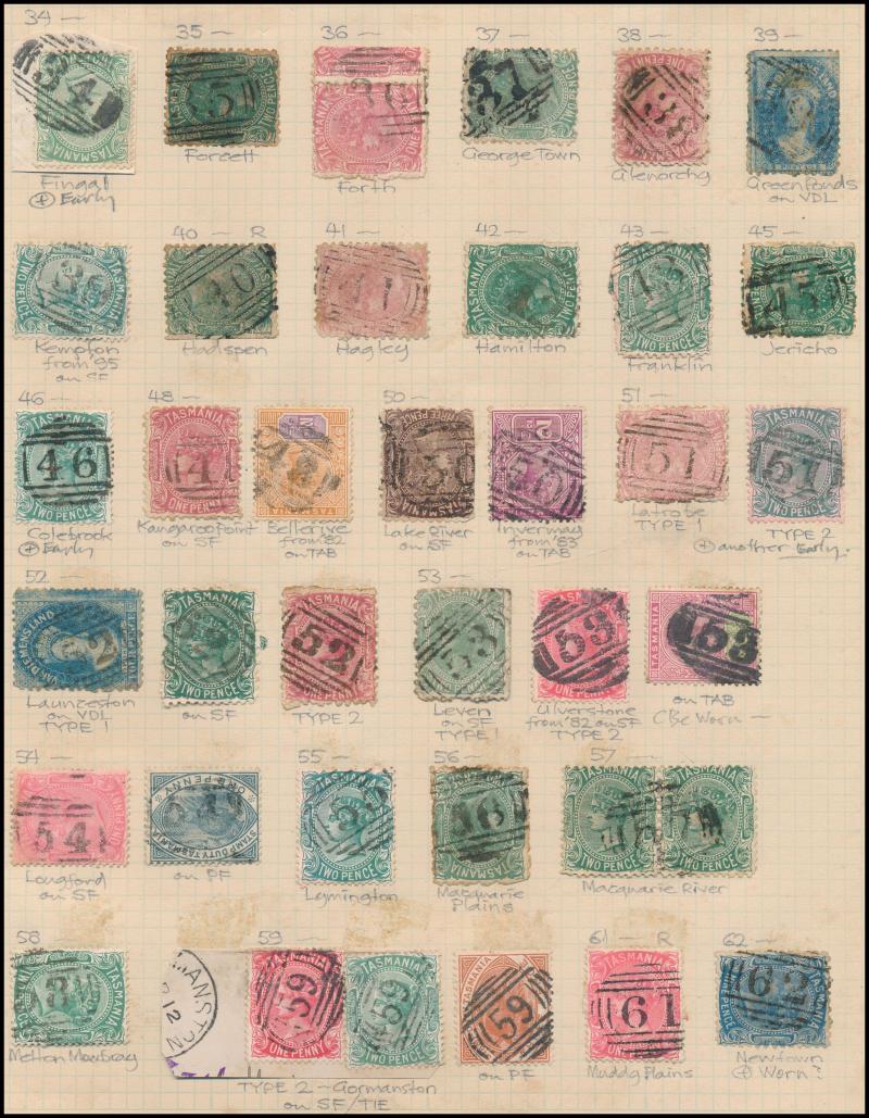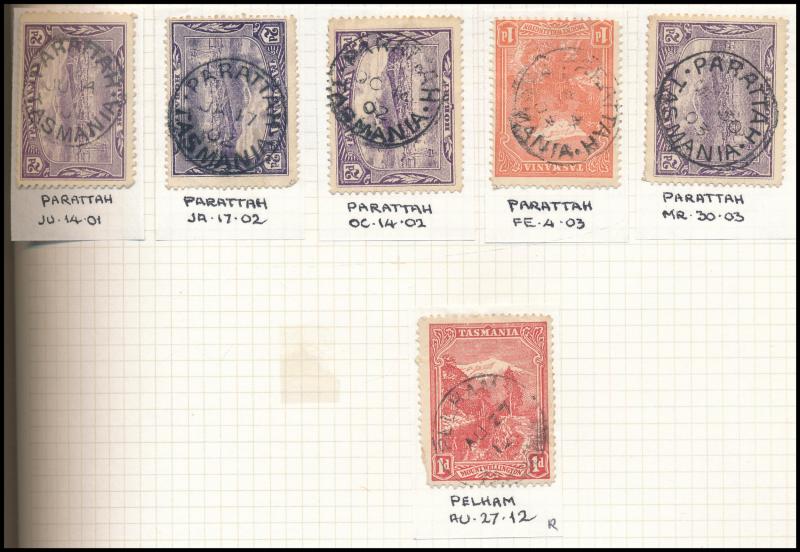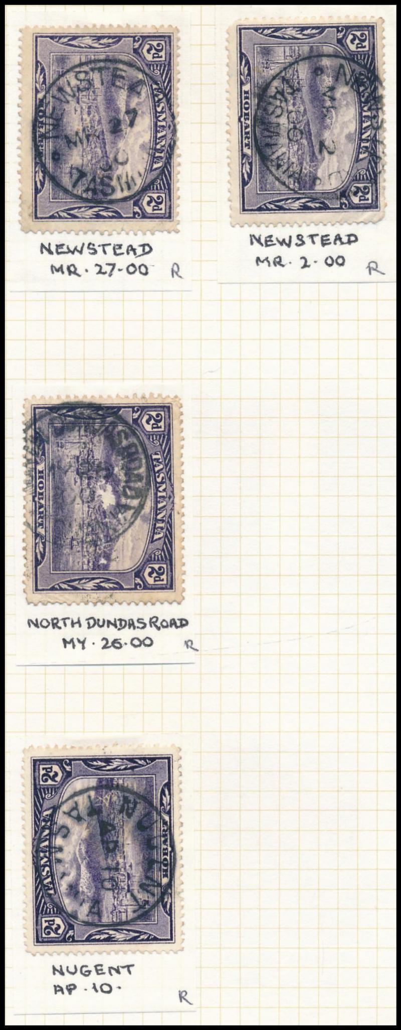 'GA[RDEN IS]LAND CREEK', 'GLADSTONE', 'SORELL' & 'TARANNA' each on 6d, also ERD & LRD section, 'abnormals' including Manuscript "Oldina" on 1d and "Myalla" & "Spreyton" on 2d, and a range of datestamps on other issues, the strikes a little variable