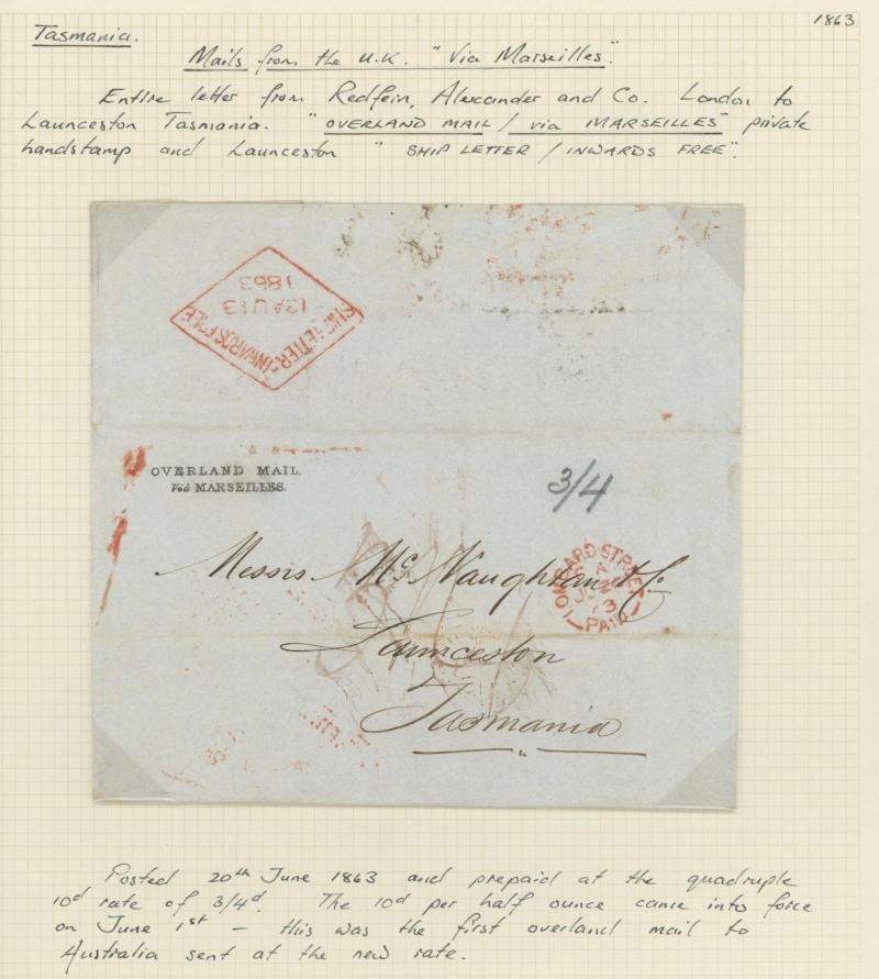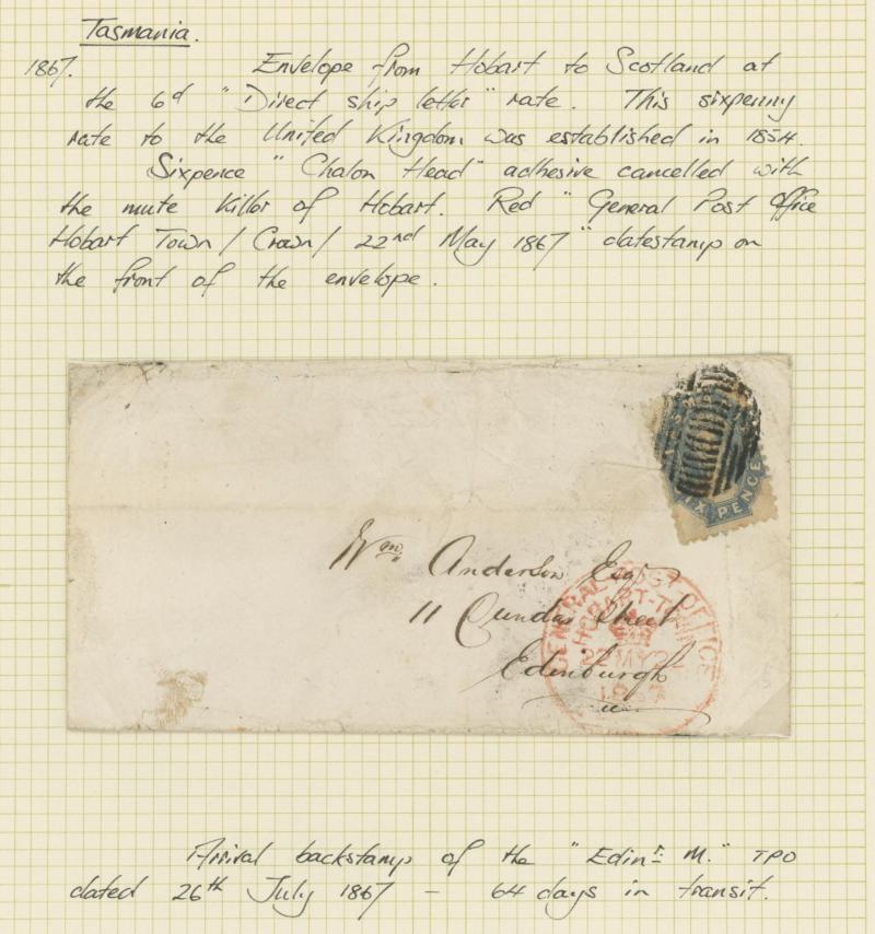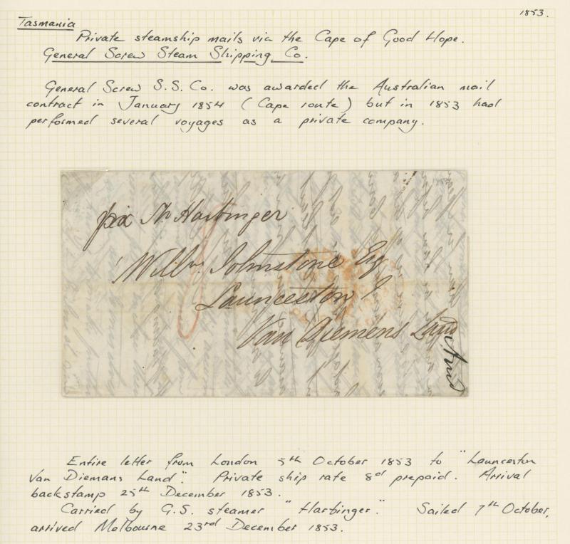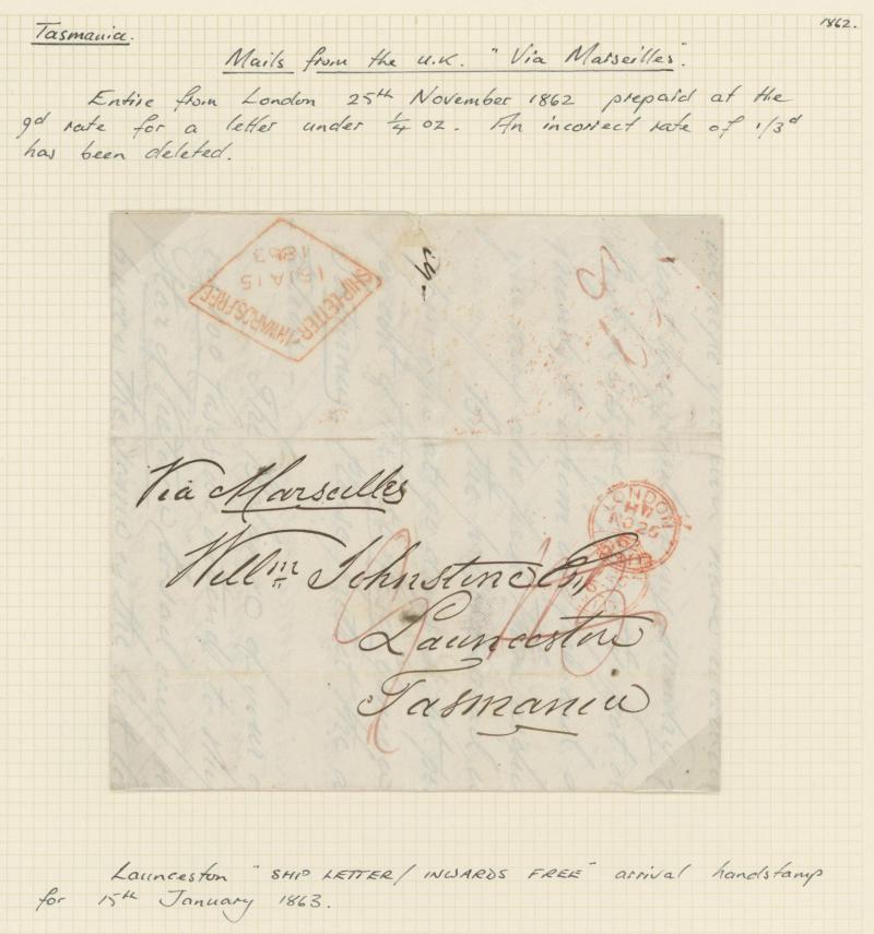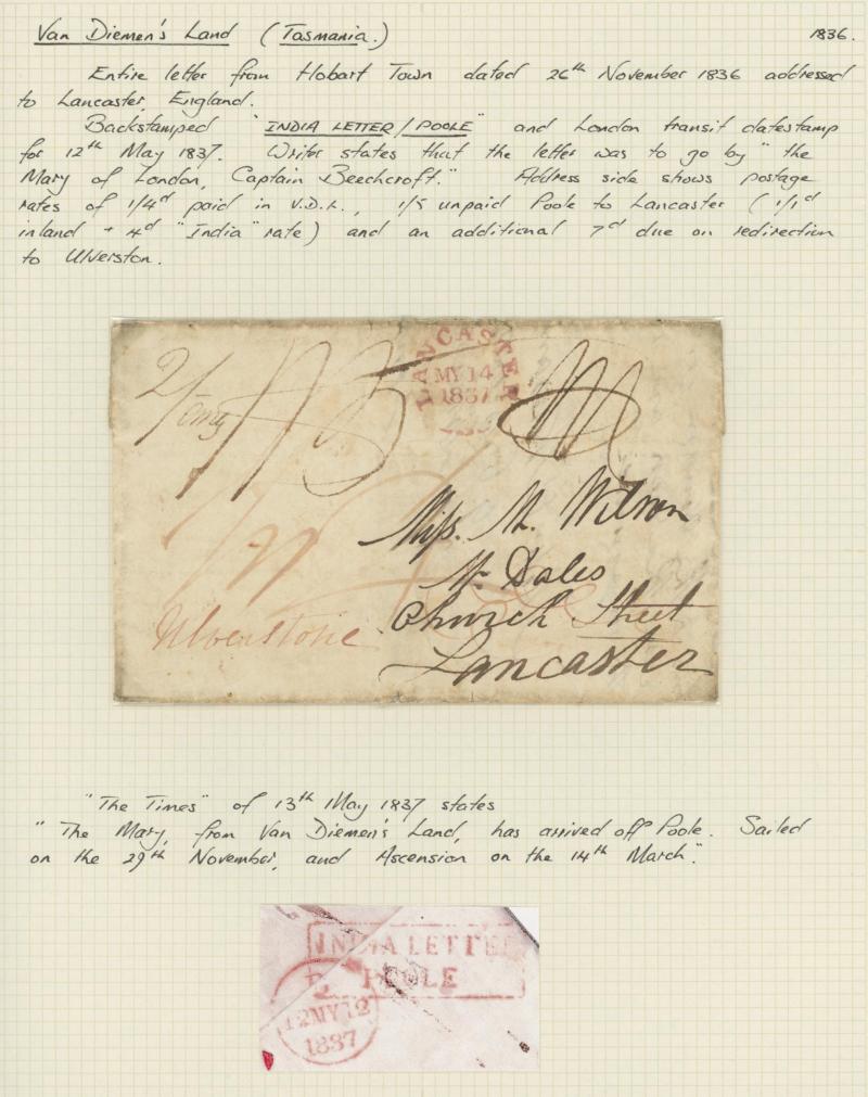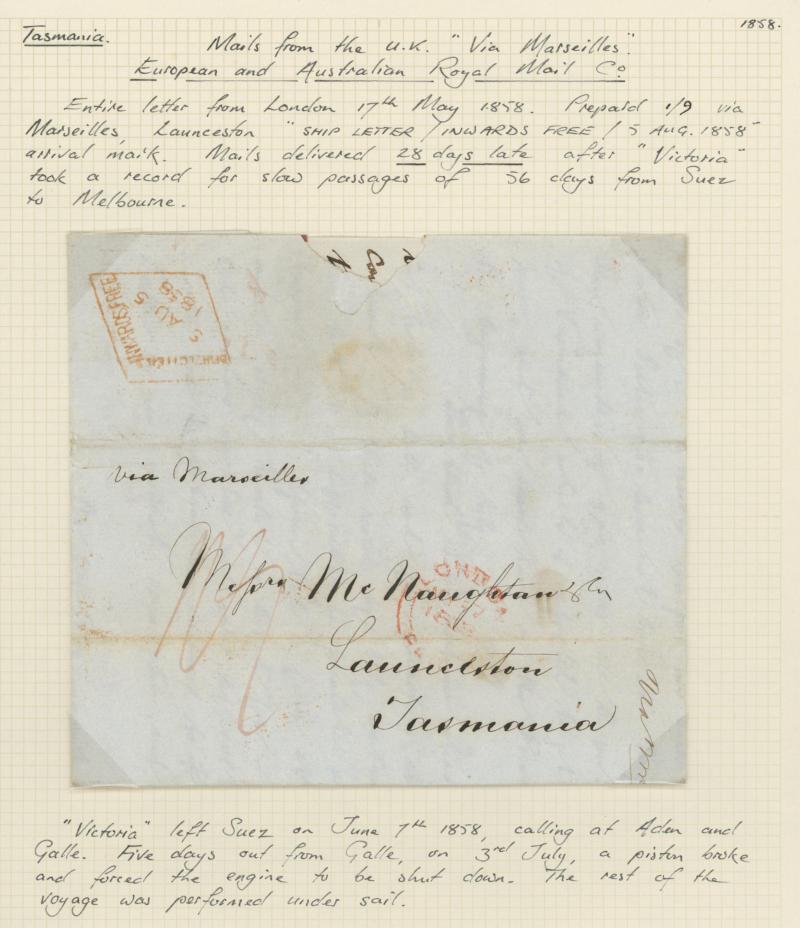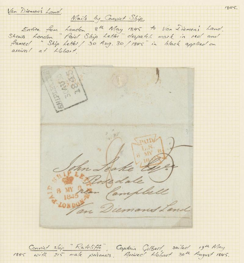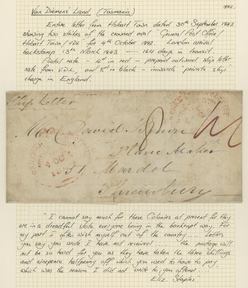 POST OFFICE/HOBART TOWN' Crowned-Oval in red, 1842 to England with two similar strikes, also inwards 1845 unstamped from London carried by Convict Ship 'Ratcliffe', 1853 unstamped from England "per Harbinger", and 1858 1862 & 1863 entires with