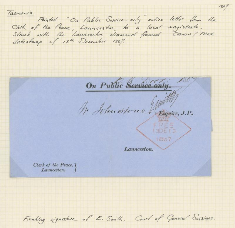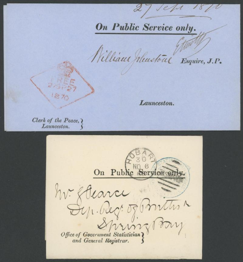 Official Mail small group comprising 1870 Clerk of the Peace notice to attend court with Launceston 'FREE' Crowned Diamond in red,