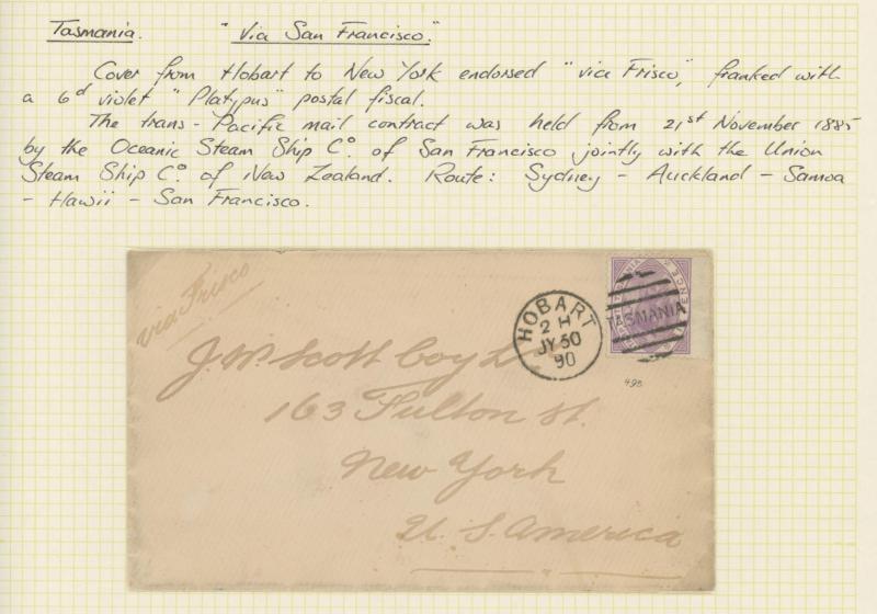 cancel, 1867 to Edinburgh with Chalon 6d violet tied bars cancel of Hobart, 1867 OPSO outer with Launceston 'FREE' Crowned-Diamond, and later items including 1890 to USA with Postal Fiscal Platypus 6d, 1895 OPSO envelope with 'HOSPITAL FOR THE INSANE