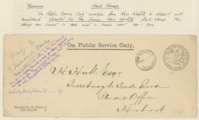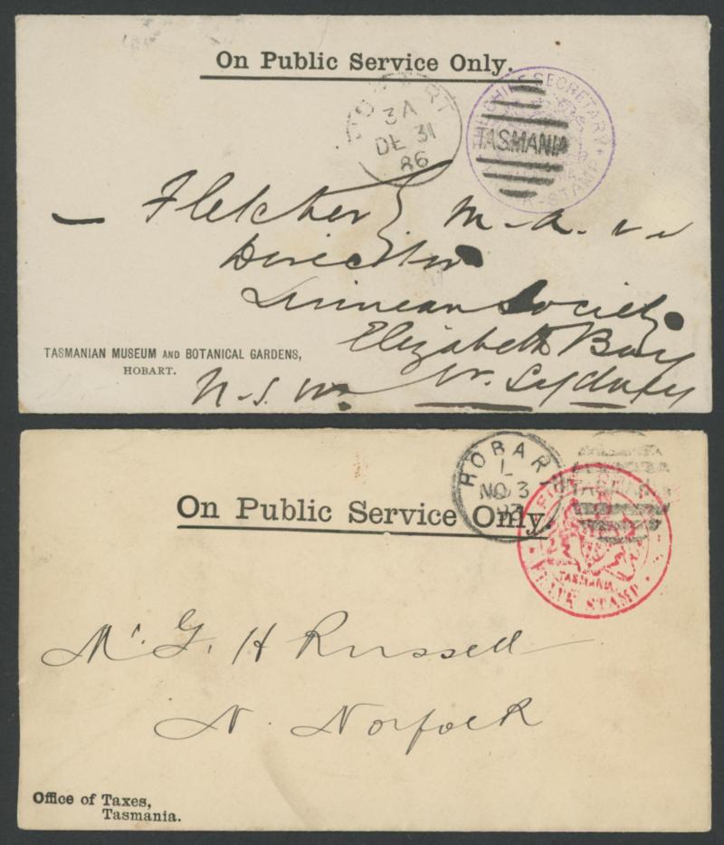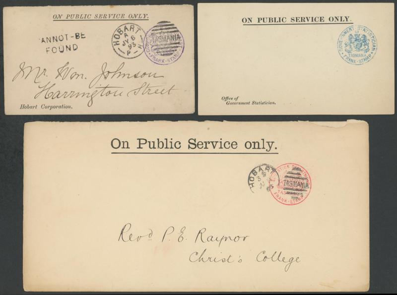 'OFFICE OF TAXES' Frank Stamp in red, 1893 Hobart Corporation envelope with 'CORPORATION OF HOBART' Frank Stamp in violet and 'CANNOT-BE/FOUND' handstamp, 1901 Post & Telegraph Department envelope to France with 'POSTMASTER LAUNCESTON' Frank Stamp in