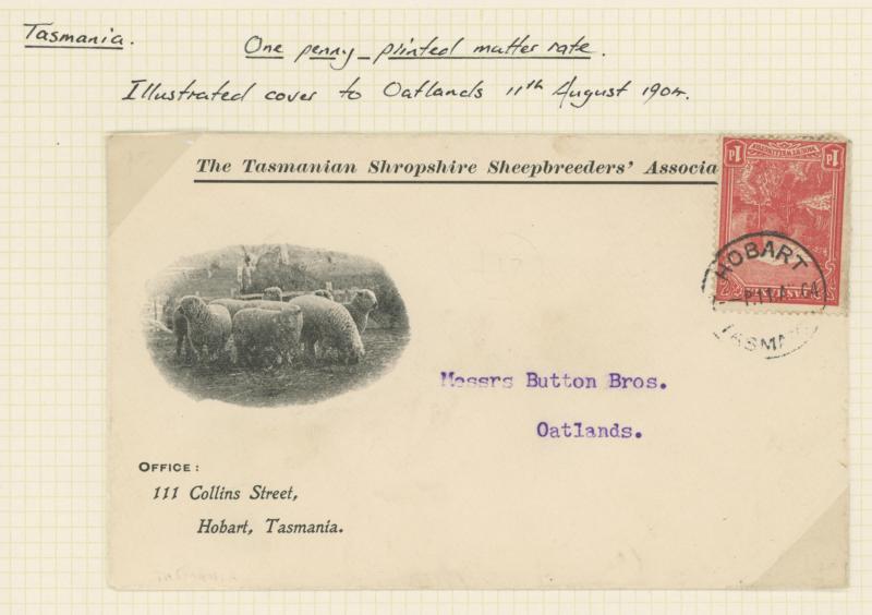NEW NORFOLK' Frank Stamp, 1904 illustrated advertising envelope for The Tasmanian Shropshire Sheepbreeders' Association with 1d Pictorial, plus a range of Postal Stationery unused & used including Mercury newspaper wrapper, AC Webster & Son envelope,