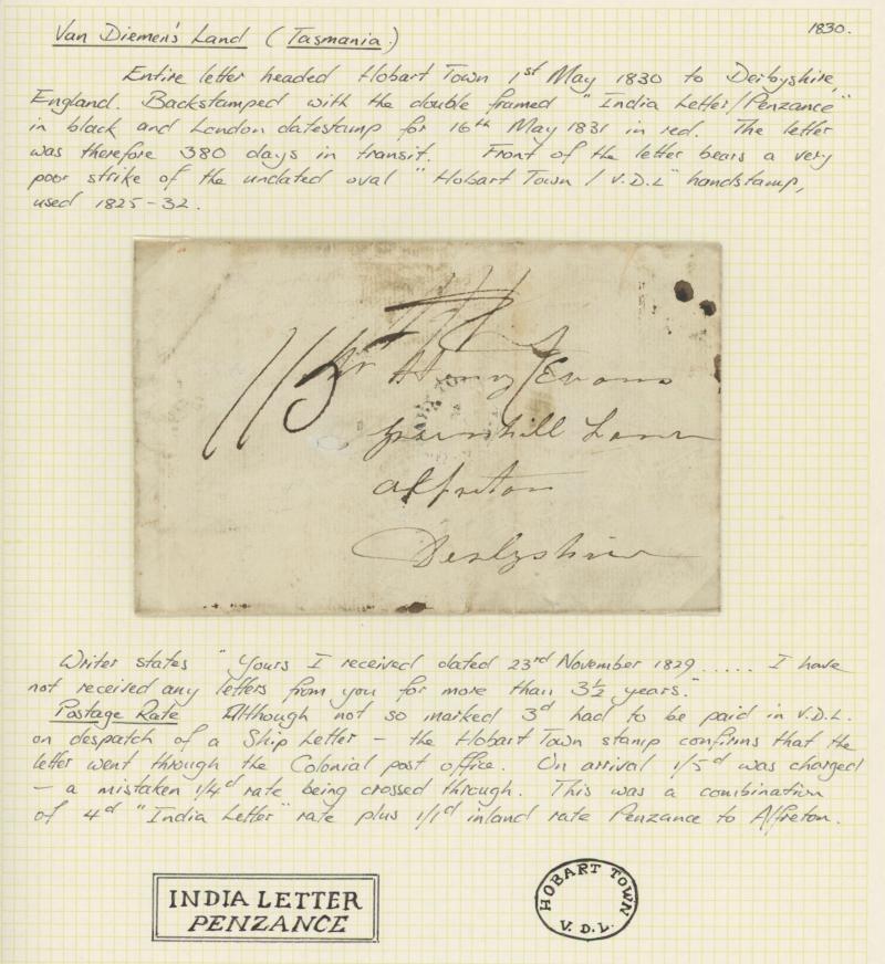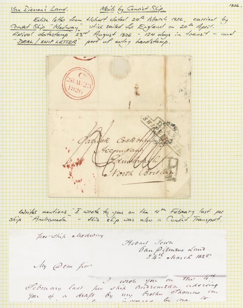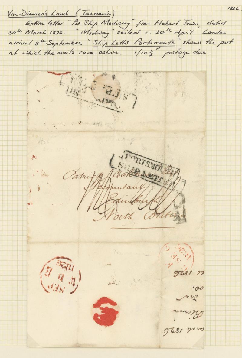 to Edinburgh with 'PORTSMOUTH/SHIP LETTER' or 'DEAL/SHIP LETTER' both carried by Convict Ship 'Medway' plus similar with fair 'HOBART TOWN/V.D.L.' small undated oval and '½' boxed Scottish turnpike cachet, 1830 entire to Derbyshire with 'INDIA