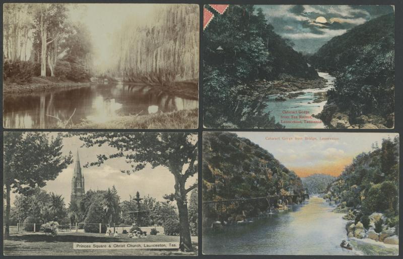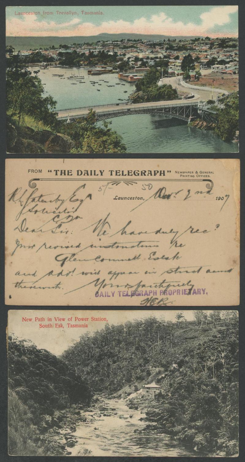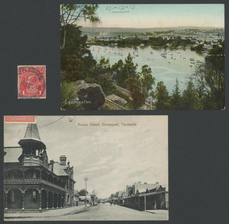 Australia envelope with 'BANKER'S PACKET/U.B.A.LD/LAUNCESTON' cachet at upper-left, plus a small bundle of picture postcards including topographicals & real photos, all with Pictorial frankings tied by a range of Launceston postmarks including