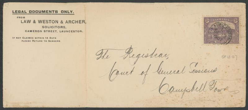 REGISTRATION ENVELOPES: 1906 No Denomination (3d) size 100x64mm, internal usage to "The Commissioner of Stamp Duties/Hobart" with