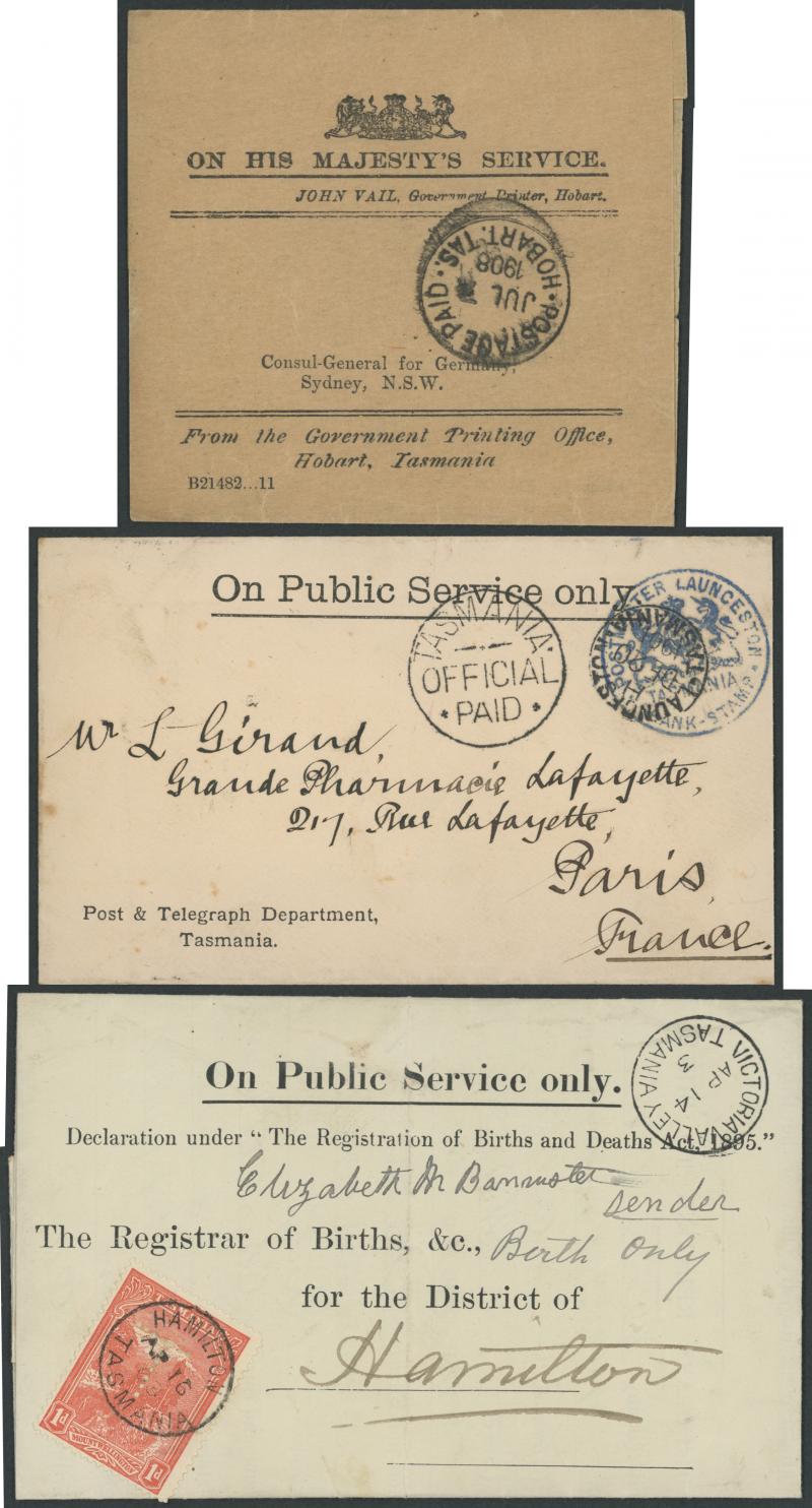 blue plus 'TASMANIA/OFFICIAL/PAID' handstamp (because Franks were not valid outside the British Empire), 1903 Registration of Births & Deaths folded circular unfranked from 'VICTORIA VALLEY' (superb) with Pictorial 1d punctured 'T' tied Hamilton cds
