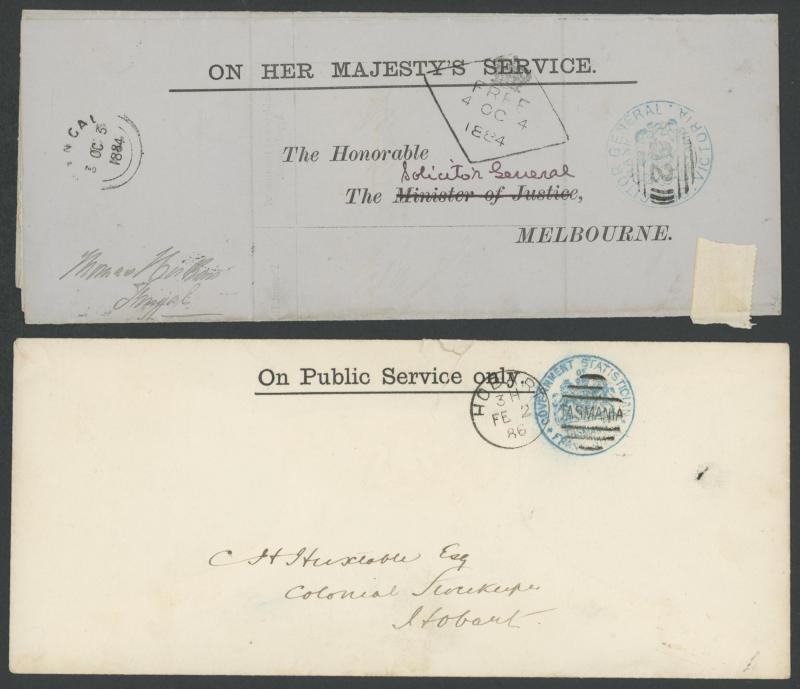 1884 Victorian Solicitor General folded circular returned with Launceston 'FREE' Crowned Diamond in black, 1886 Tasmanian Museum & Botanical Gardens envelope with 'THE CHIEF SECRETARY' Frank Stamp, 1886 Office of Government Statistician wrapper with