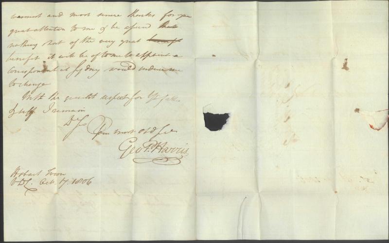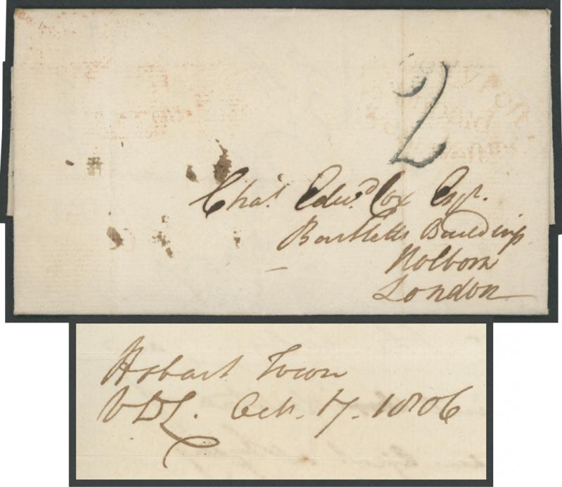 1806 (Oct 7) entire letter signed "Geo P Harris, Hobart Town, VDL", to Charles Edward Cox Esq, Holborn, London with light 'Penny