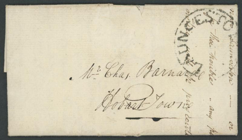 1822 (Dec 21) entire letter to "Hobart Town" with largely very fine almost complete strike of the large 'LAUNCESTON' undated