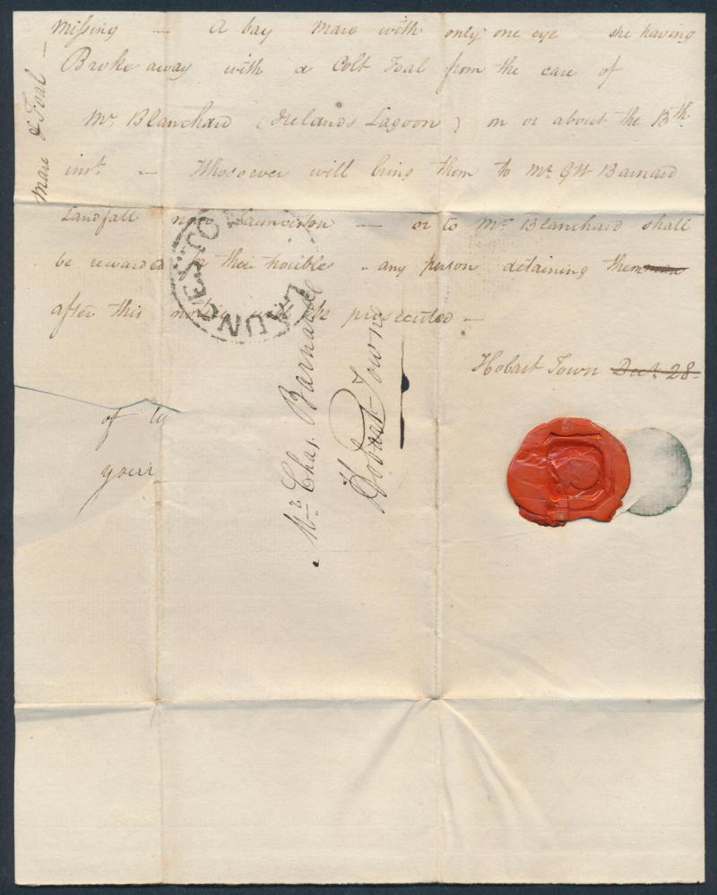 edge faults where the paper was torn away from the very fine wax seal on the reverse. Ex Dr Owen Ingles. PO 1816. This is the first handstamp used at Launceston, and is recorded from 1822-26 only. Brian Peace's 1823 example from the same