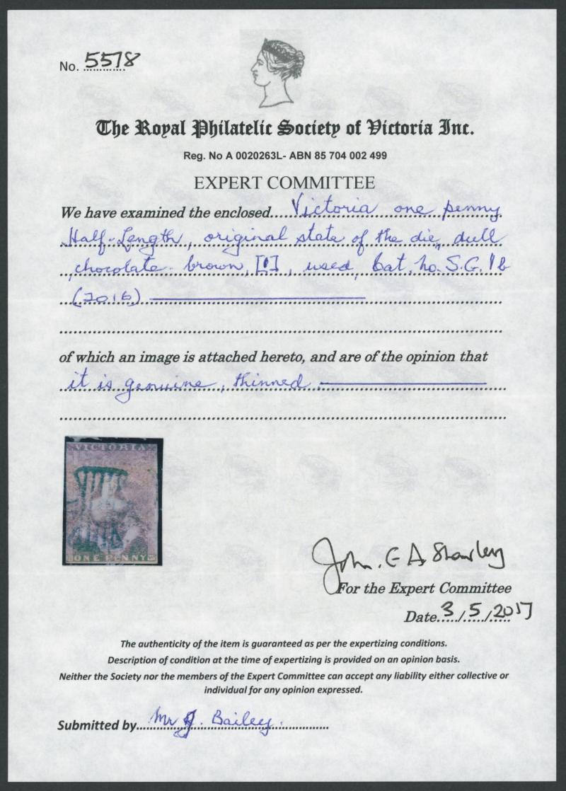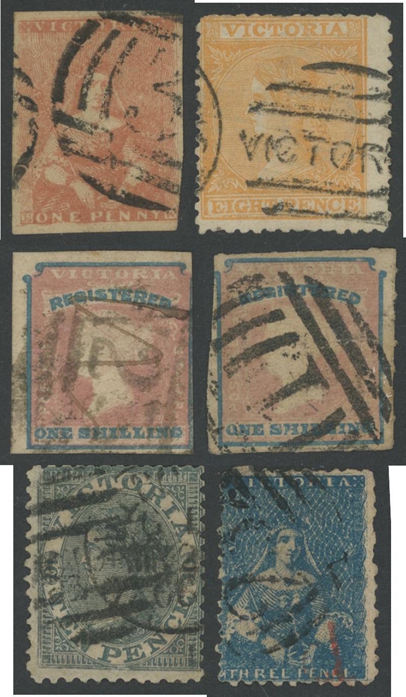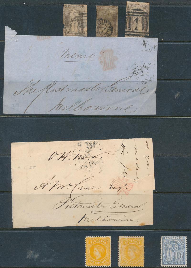 & on the reverse very fine strikes of 'BARWON/PT PHILLIP' & 'GEELONG/PORT PHILLIP' crowned-oval datestamps, rated "d6" in red for carriage between 21 & 30 miles, minor blemishes. Ex Ray Kelly - sold at our auction of 19.7.2003 for $2800 (Sale 104 Lot