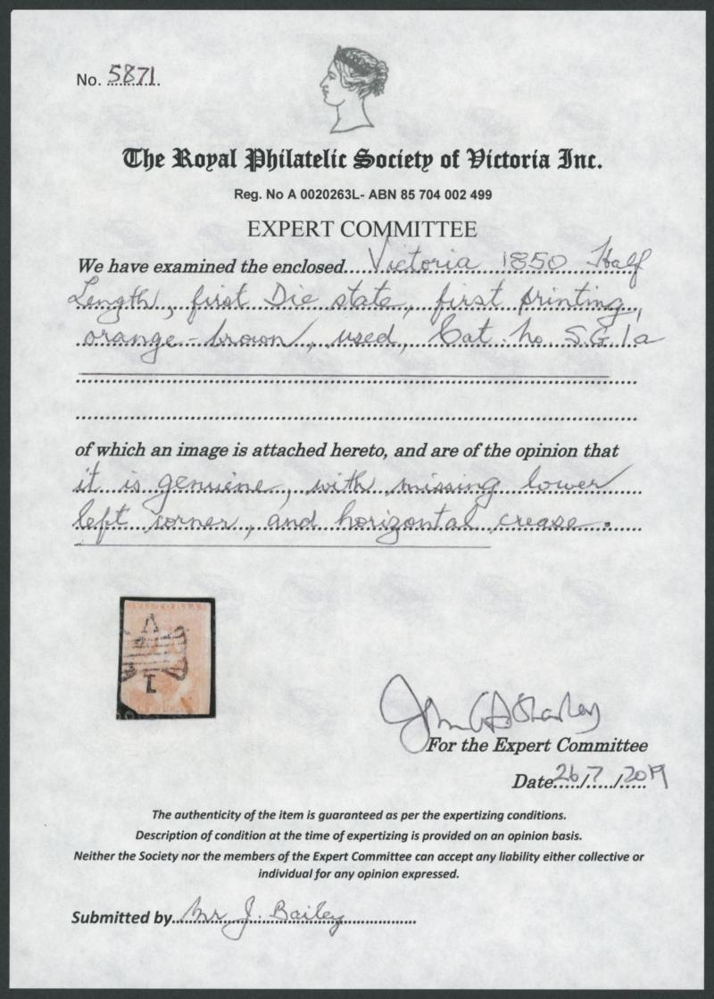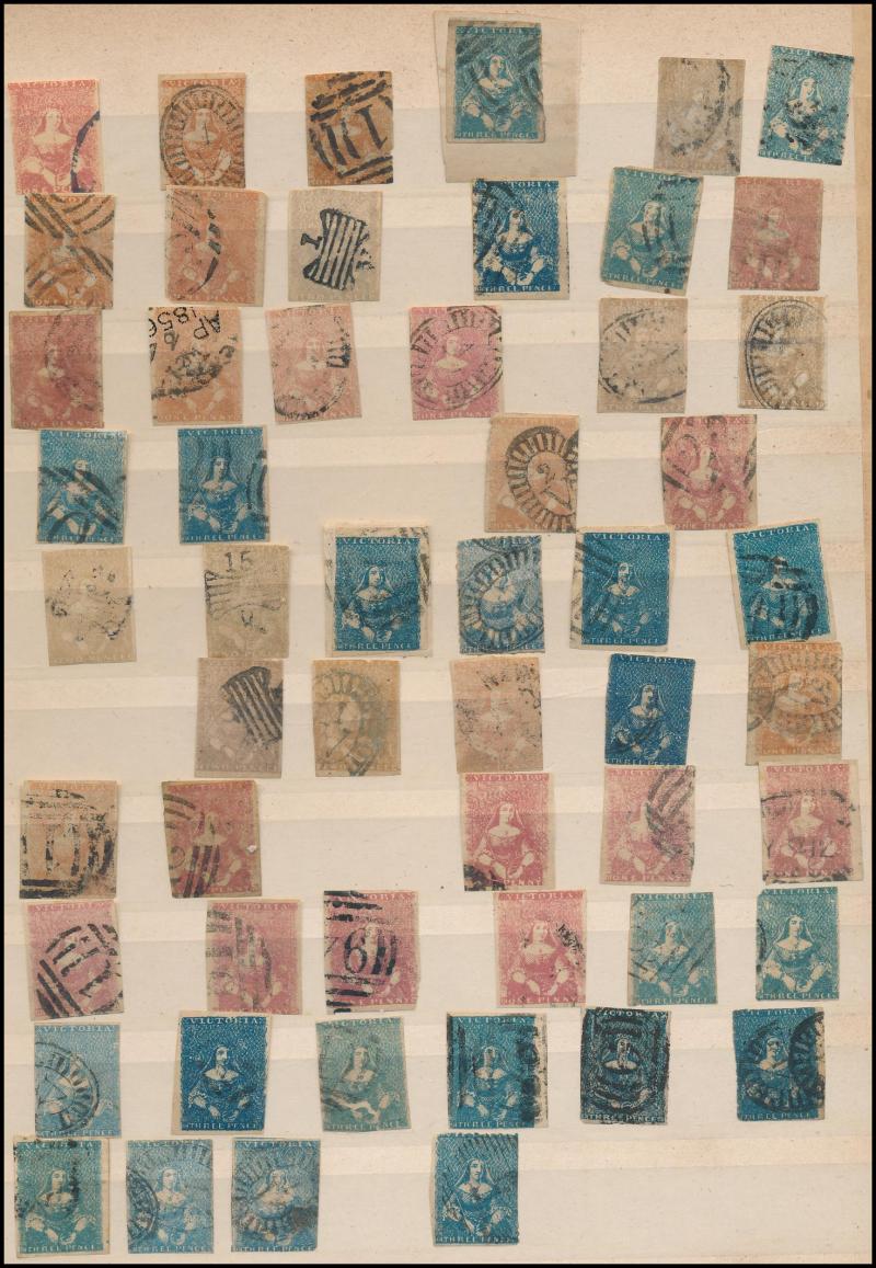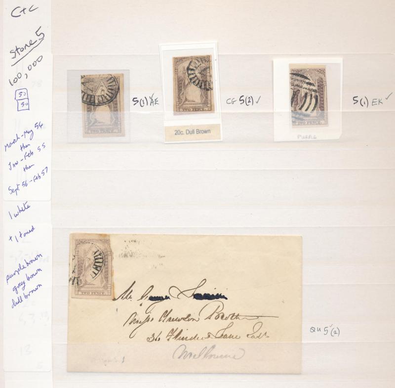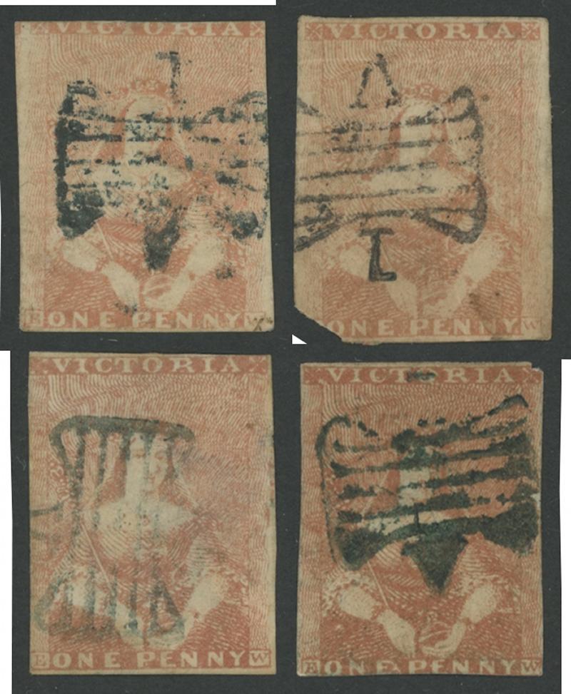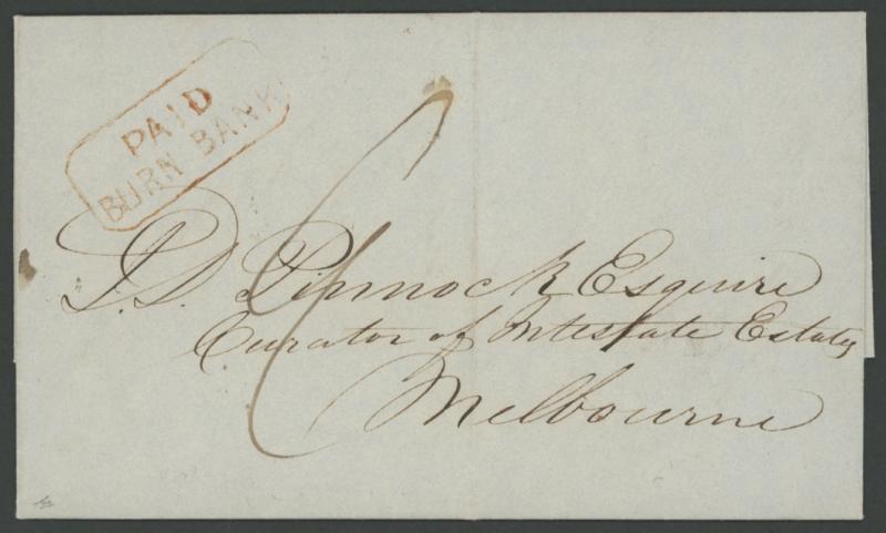 Estates with largely very fine strikes of the bevelled-boxed 'PAID/BURN BANK' handstamp in red and crowned-oval 'BURN BANK/NO*20/1849/PT PHILLIP' backstamp, faint Melbourne arrival. Ex JRW Purves and 'Besancon' (II): sold in 2018 for SFr965. The