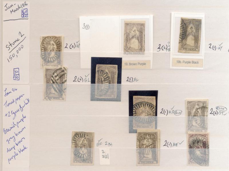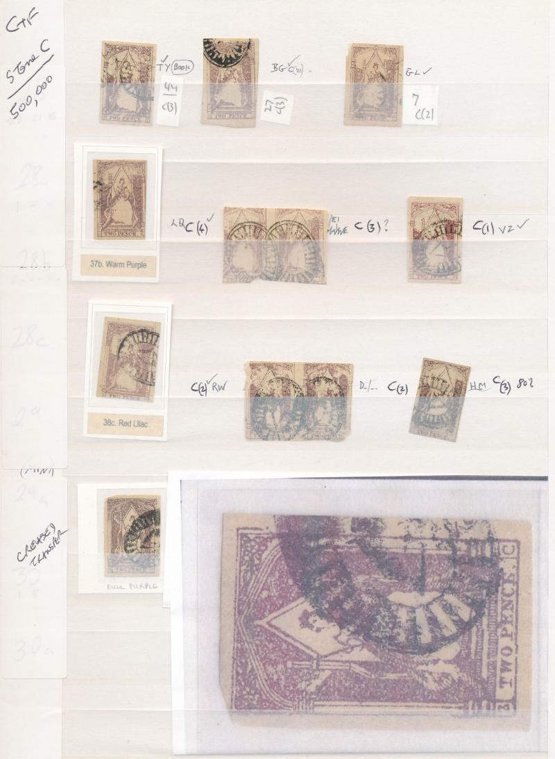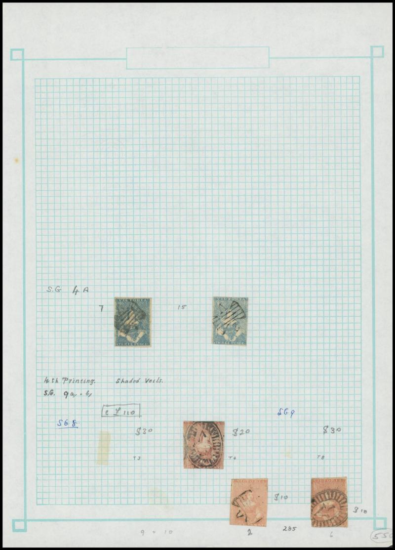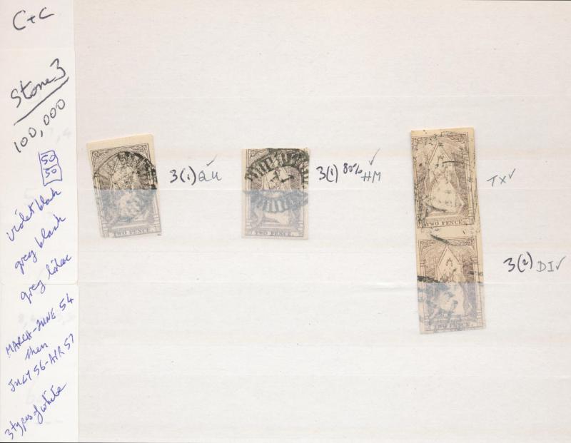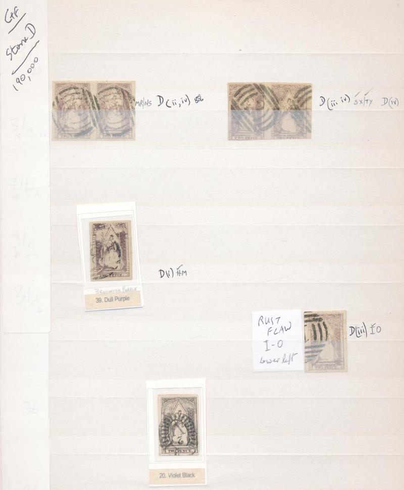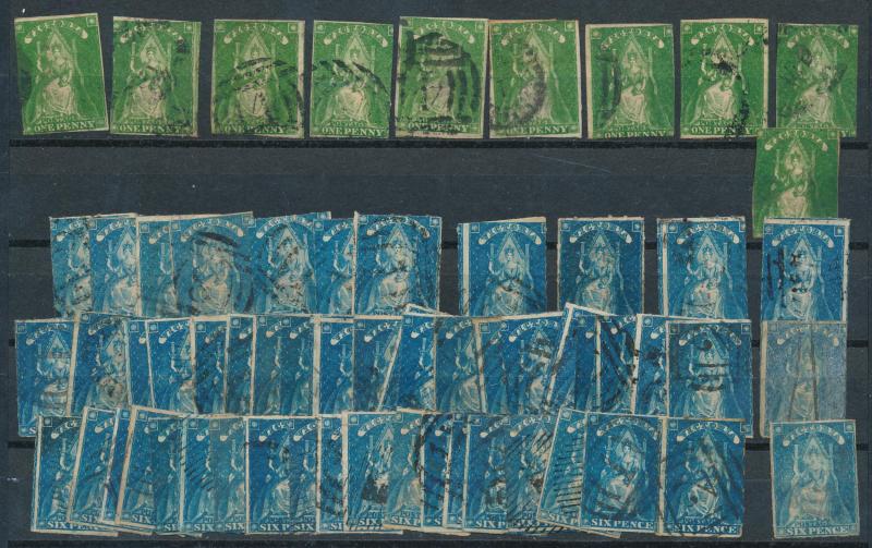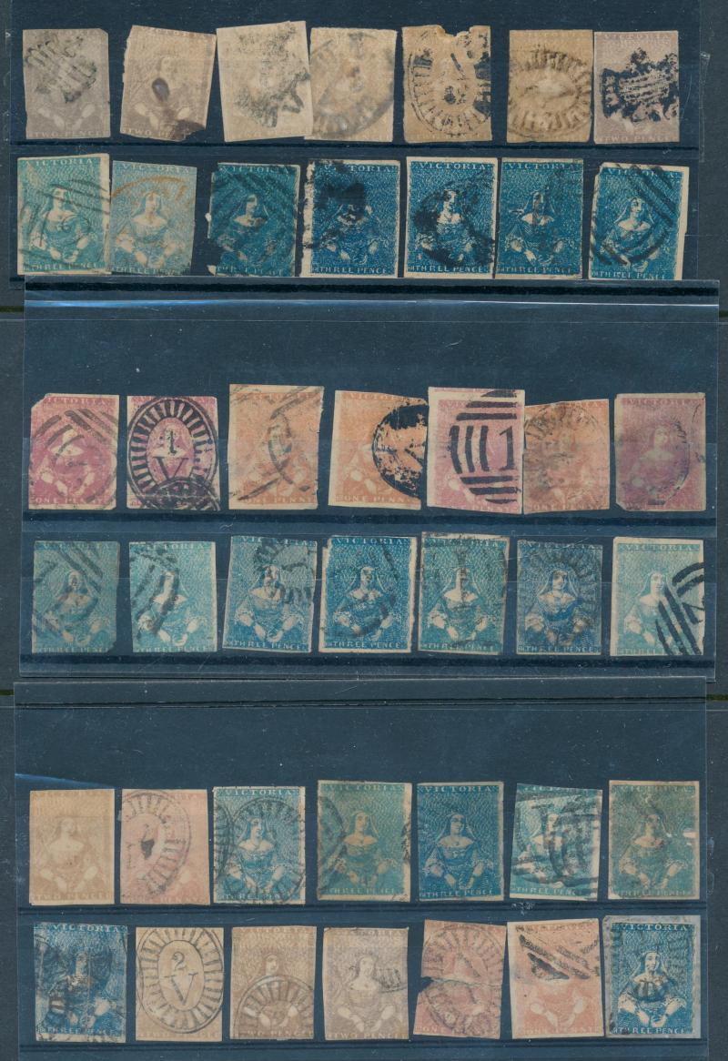 x32 & 3d x43 including two pairs & a defective strip of 4; Rouletted 3d x3; Perf 12 3d x4; and a page of forgeries & reprints plus a Jeffryes 3d sheet of 50 (10x5); condition very mixed but with many attractive stamps. We have not confirmed any of