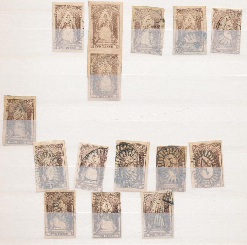 1852-58 Queen-on-Throne duplicated array with 2d x91 including several pairs plus a single on a local cover, also Imperf 1d