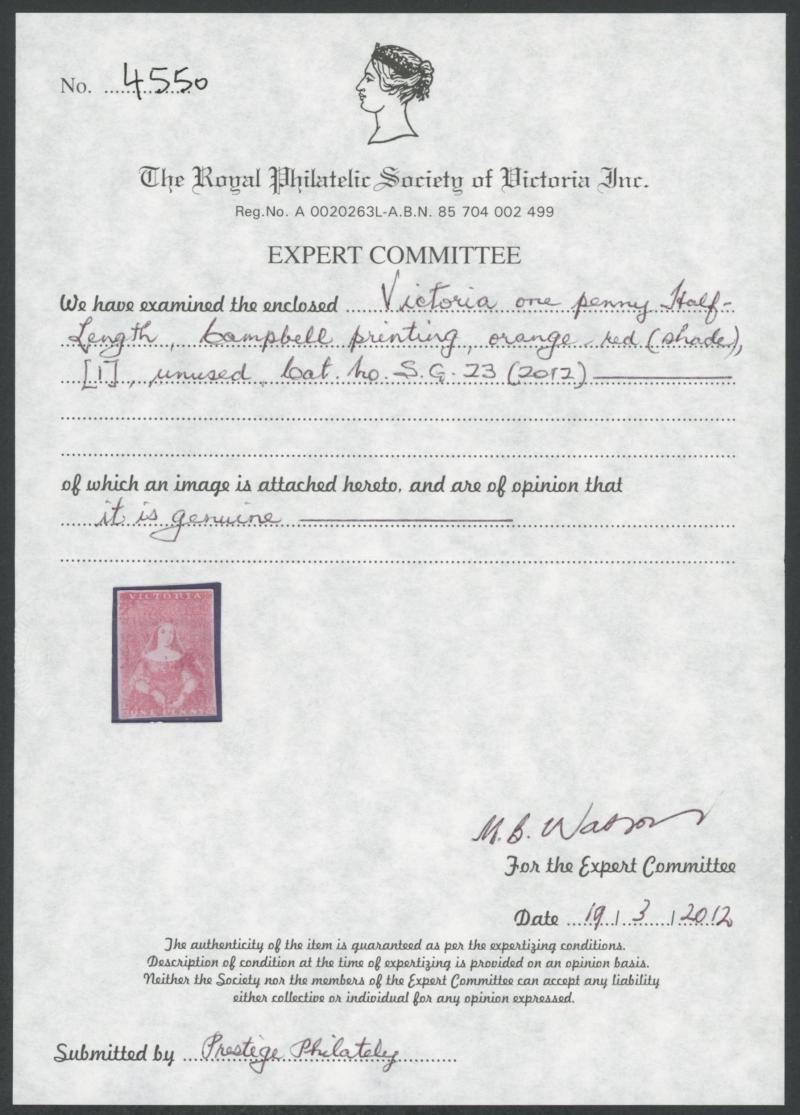 1854 QV Half-Lengths JS Campbell & Co Printings 1d orange-red SG 23 [1], margins just clear to good, pale shade, unused, Cat £3750.