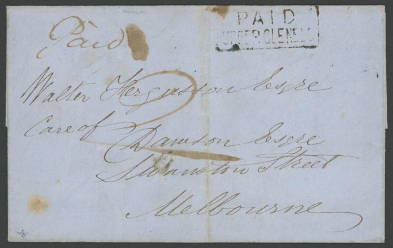 1850 entire mercantile letter headed "Geelong July 23rd 1850" to Melbourne rated "2" but with boxed 'PAID/UPPER GLENELG' handstamp,