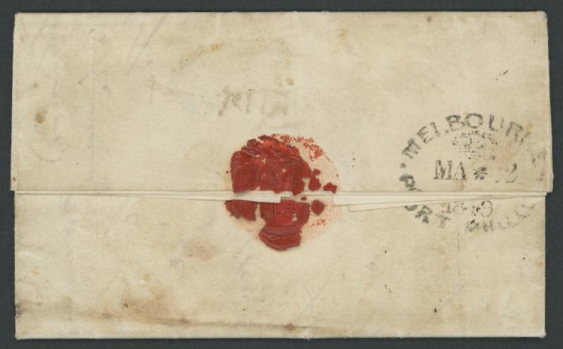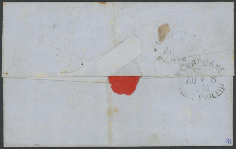 the reverse with light crowned-oval 'UPPER GLENELG/AU--/1850/PORT PHILLIP' backstamp & Melbourne arrival of 'AU*8/1850', minor blemishes and central vertical filing fold clear of the markings. Upper Glenelg PO 1.3.1849; renamed Harrow 1.1.1854.