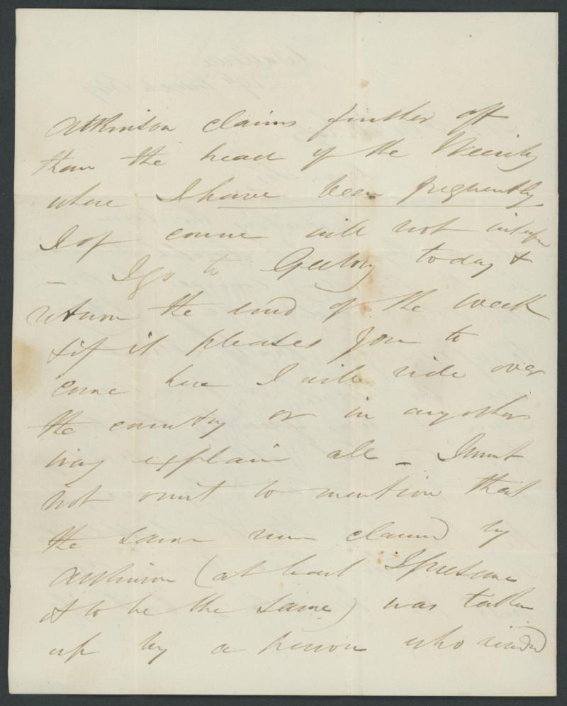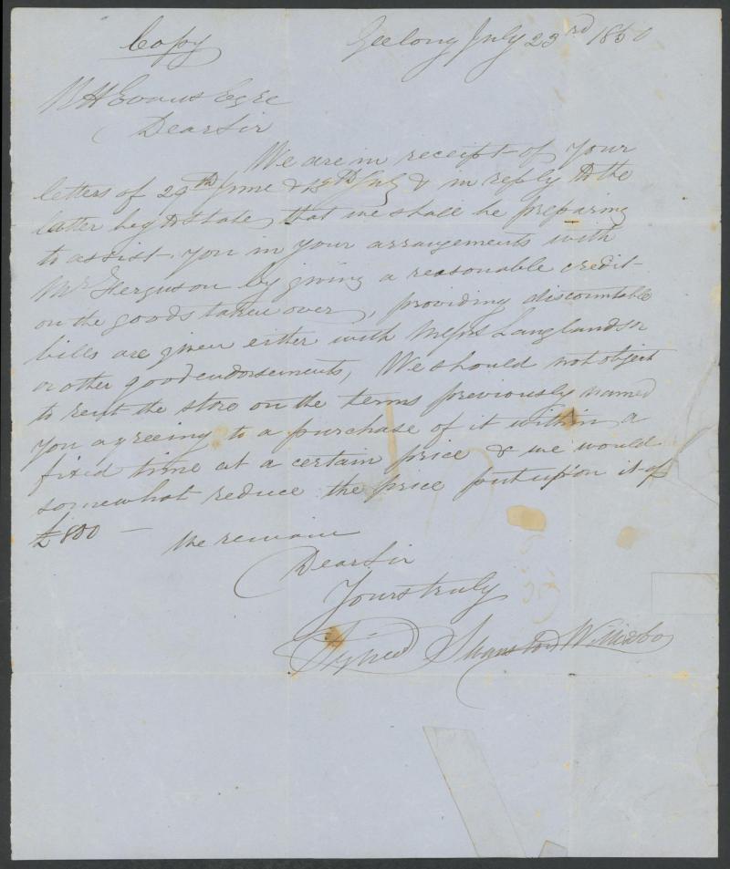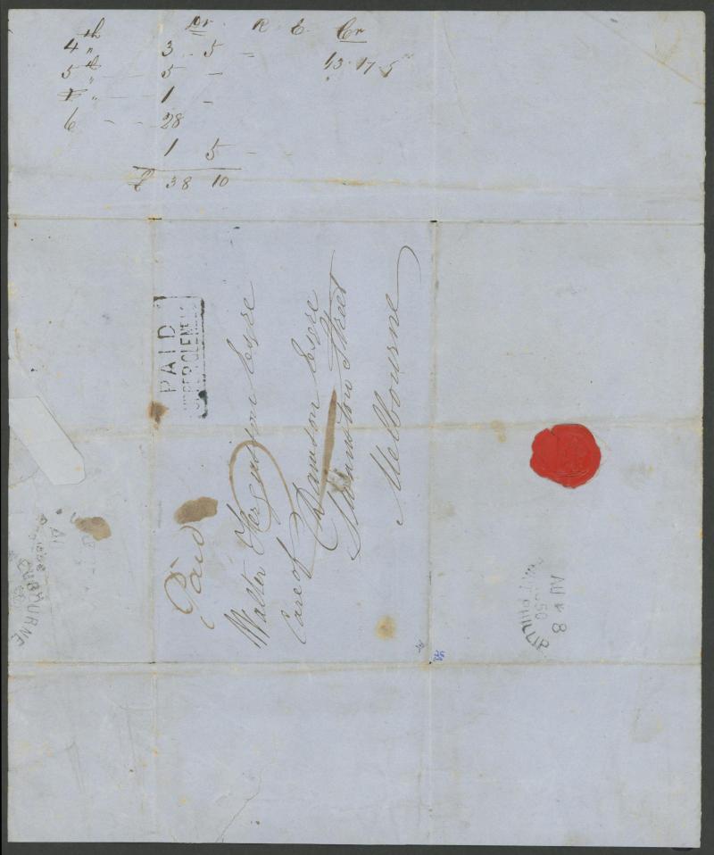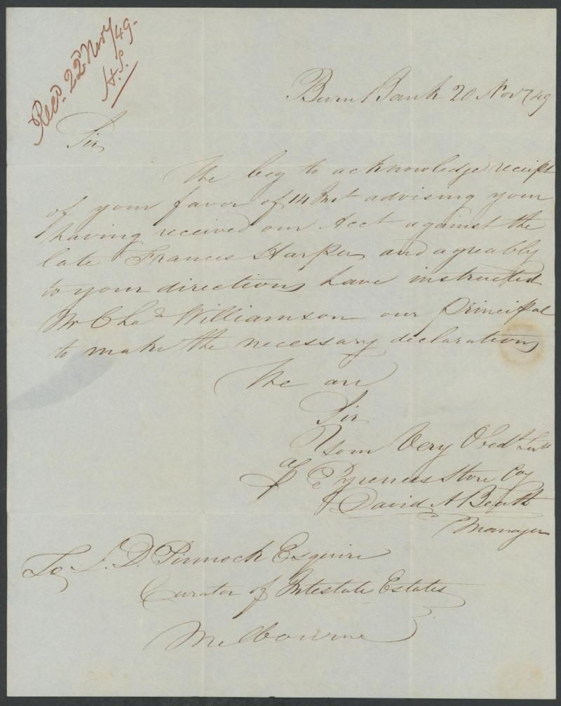 letter relates to money owing by late Frances Harper for goods supplied. Burn Bank PO 1.7.1848; renamed Lexton 1.1.1854. (Image1) (Image2)