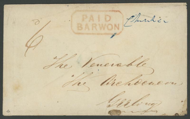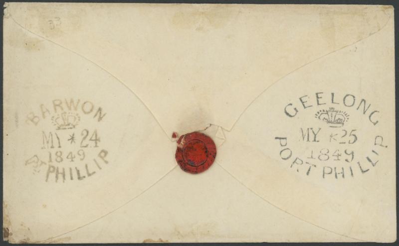 1849 (May 24) envelope to "The Venerable/The Archdeacon/Geelong" with very fine strike of the boxed 'PAID/BARWON' handstamp in red