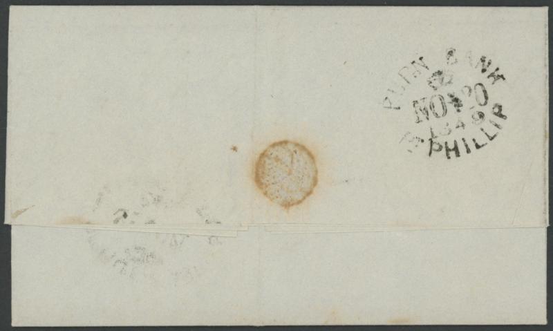 crowned-oval 'THE GLENELG/JU*26/1849/PORT PHILLIP' transit & light 'PORTLAND/NEW.S.WALES' arrival. Ex JRW Purves - illustrated by him at page 17 of "Port Phillip District" - Tom Roberts (1989), Hugh Freeman, Michael Silvasich: sold for $3220 (Sale