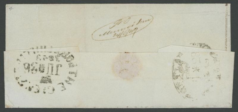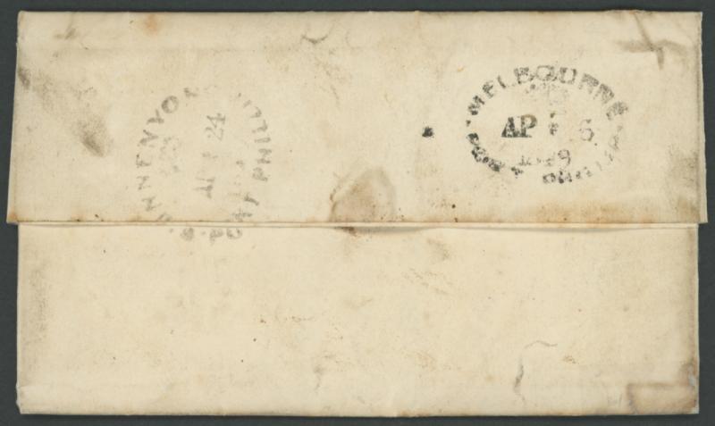 the letter signed "JL von Stieglitz" and headed "Ballan" but carried privately to Melbourne where rated "1" as a 'drop letter' & with fine crowned-oval 'MELBOURNE/ MA*22/1849/PORT PHILLIP' backstamp, minor soiling & and a few light aging marks. Ex