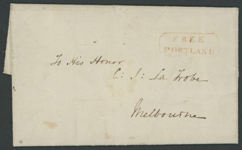 very fine strike of the scarce rounded-boxed 'FREE/PORTLAND' handstamp (#F17) in red, part crowned-ovals 'PORTLAND/NEW S.WALES' & 'MELBOURNE/PORT PHILLIP' backstamps. Ex JRW Purves and Brian Peace: sold for $2795 (Sale 148 Lot 1223). The letter from