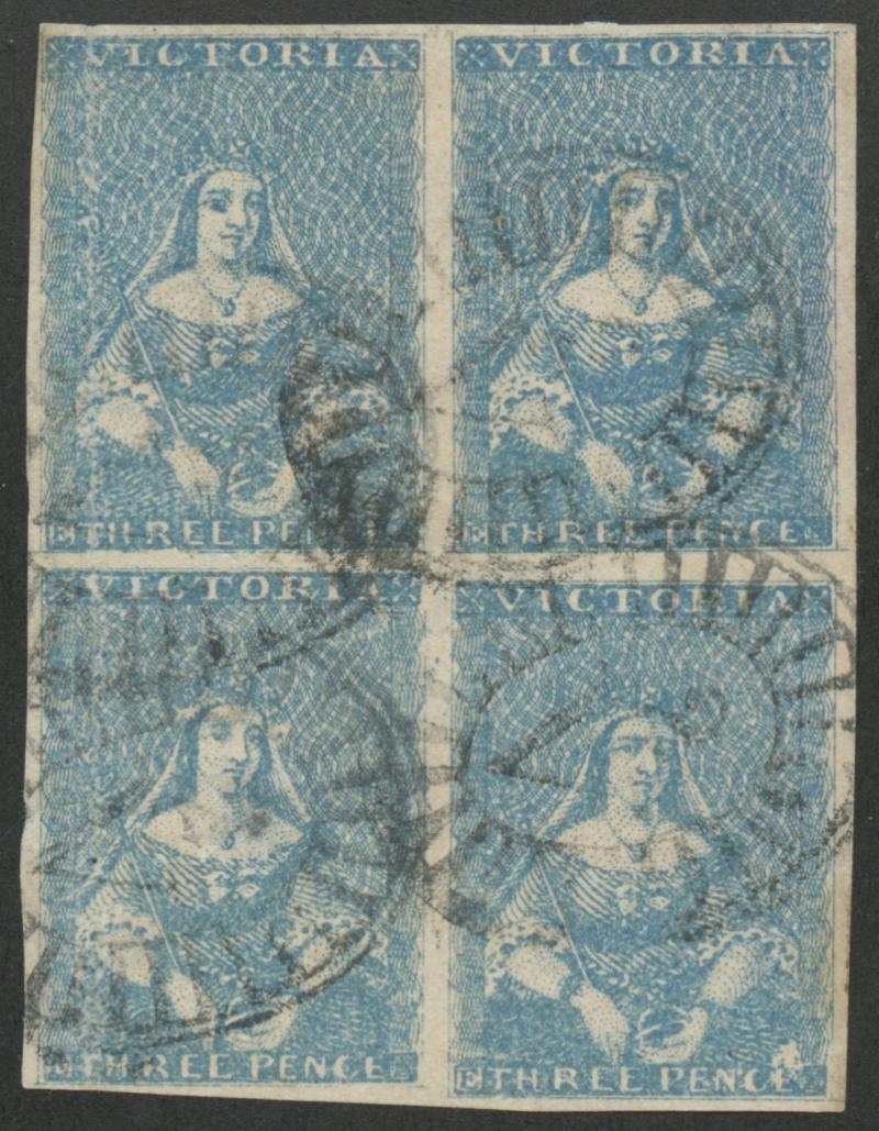 1854 QV Half-Lengths JS Campbell & Co Printings 3d blue SG 24 block of 4 [15-16/21-22], an unusually large multiple with margins