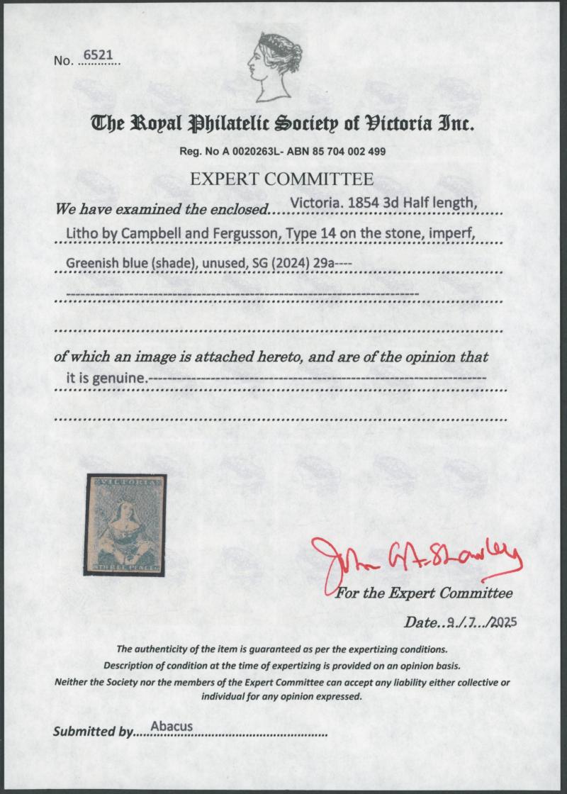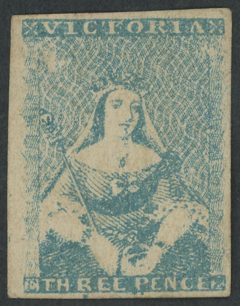 1854-57 QV Half-Lengths Campbell & Fergusson Printings 3d greenish-blue SG 29a, margins good to large at left, unused, Cat £2250. A