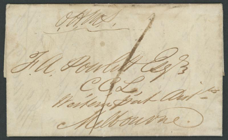 1849 (March 19) entire to "JA Powlett Esq, CCL [= Commissioner of Crown Lands], Western Port Asstn, Melbourne" endorsed "OHMS" with