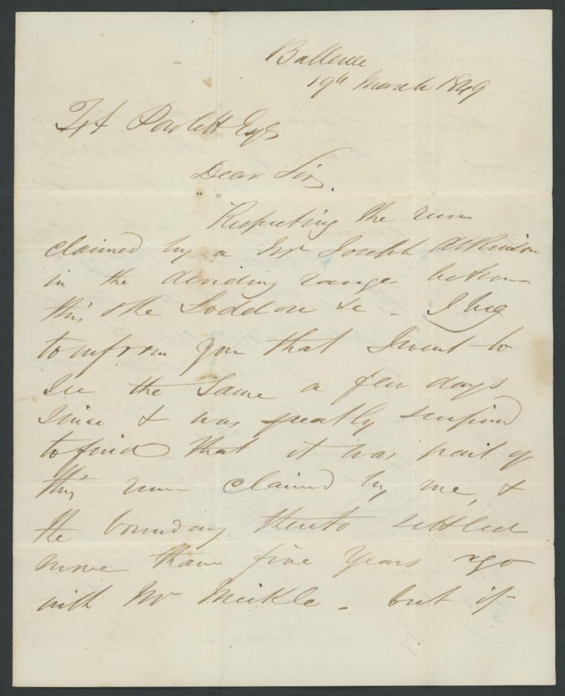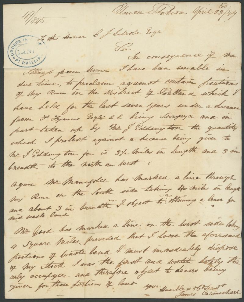 Steiglitz is named after them (but note the misspelling). The letter objects to a claim that encroaches on their property at "... the head of the Weeriby ..." (Werribee River). (Image1) (Image2)