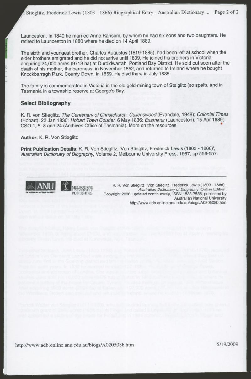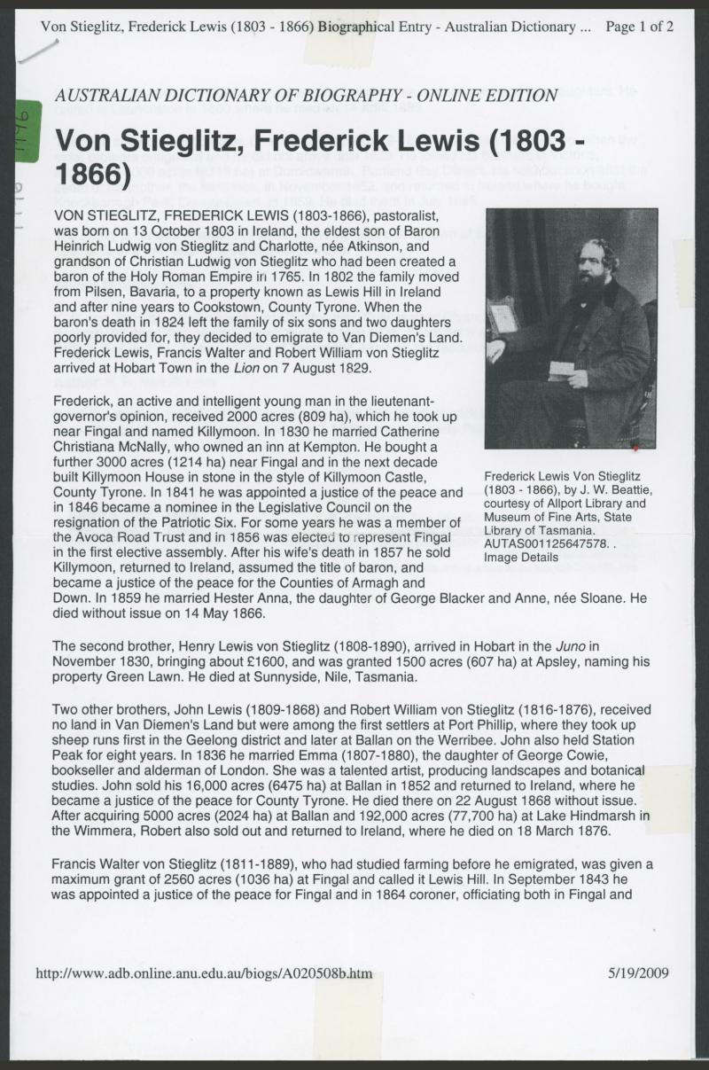 Brian Peace: sold at our auction of 7.5.2013 for $437 (Sale 180 Lot 440). Brothers John Lewis & Robert von Stieglitz were among the earliest settlers in the Port Phillip District, taking up sheep runs at Geelong & Ballan. The goldmining town of