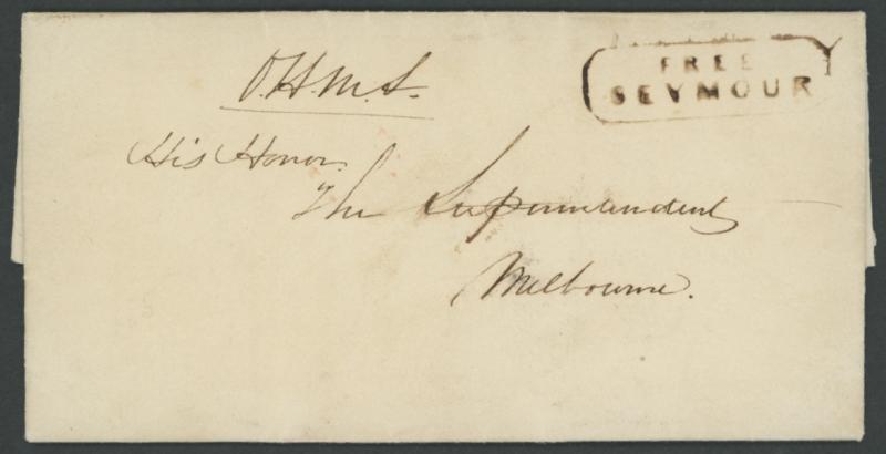 of the rare 'FREE/SEYMOUR' rounded-boxed handstamp (F17) in blackish-red, the reverse with fair crowned-oval 'SEYMOUR/PORT PHILLIP' and Melbourne arrival of the next day, very fine. Ex Hans Karman: sold at our auction of 2.10.2010 for $1552 (Sale 158