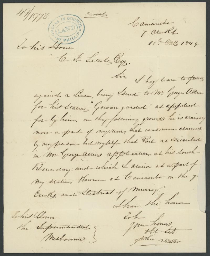 1849 (Oct 17) entire headed "Caniambo" endorsed "OHMS" to Superintendent Charles La Trobe at Melbourne with a largely fine strike