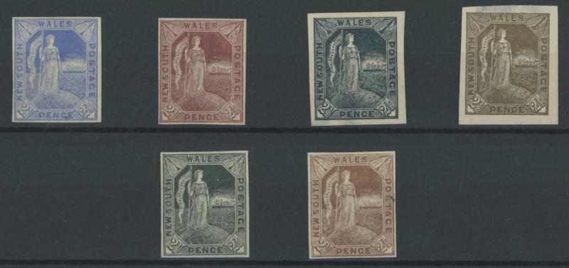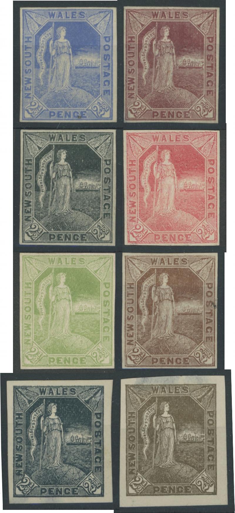 x10 all Perf 12 on thick ungummed unwatermarked wove paper, generally very fine to superb. Ex 'Carrington' (Mark Dankin): sold in 2012 for $4890, where it was stated that this is believed to be the full range of colours produced for each